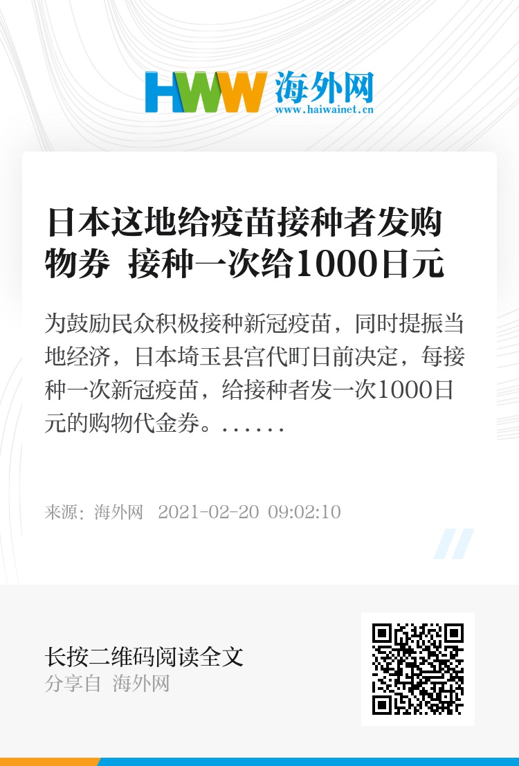 海外网2月20日电 为鼓励民众积极接种新冠疫苗,同时提振当地经济,日本埼玉县宫代町日前决定,每接种一次新冠疫苗,给接种者发一次1000日元的购物代金券,可在宫代町当地使用。