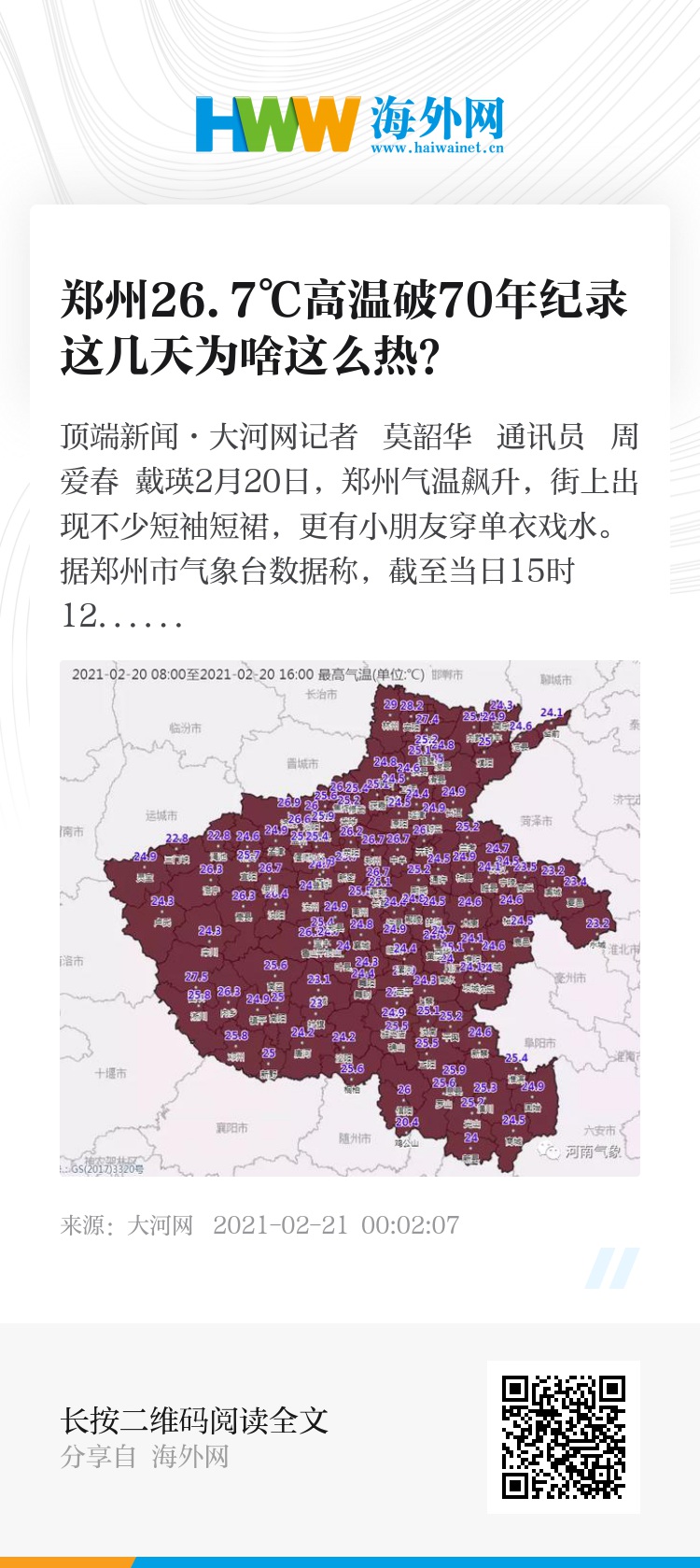 2月20日,郑州气温飙升,街上出现不少短袖短裙,更有小朋友穿单衣戏水。据郑州市气象台数据称,截至当日15时12分,郑州市最高气温已经高达26.7℃,突破了自1951年有气象记录以来近70年2月份最高气温历史纪录。