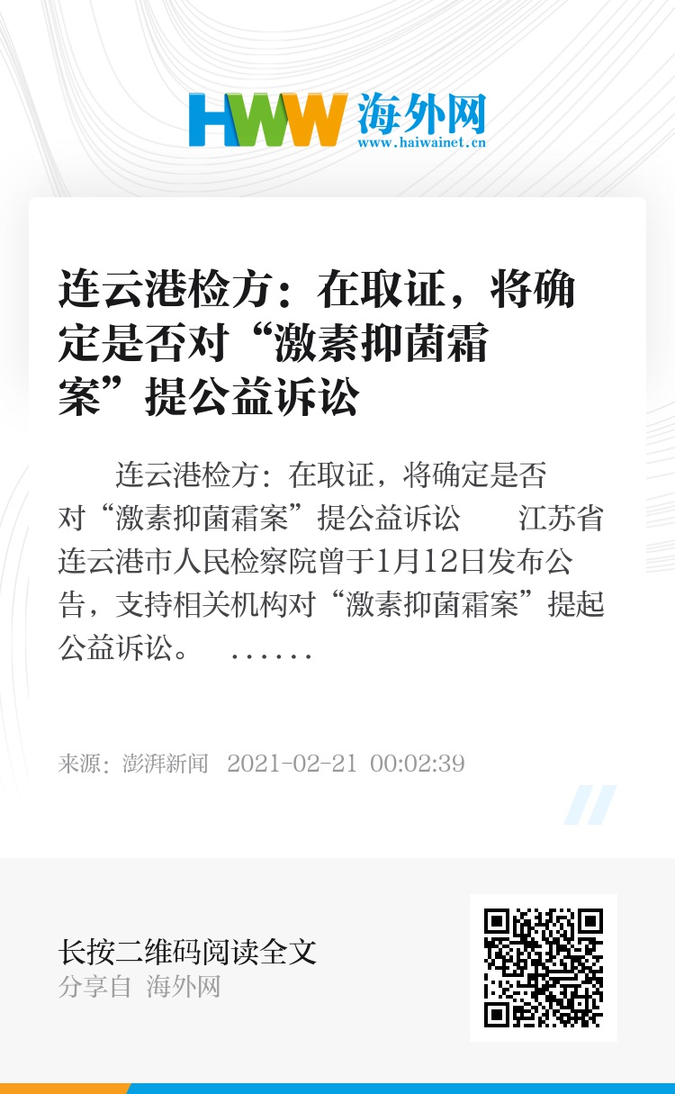 江苏省连云港市人民检察院曾于1月12日发布公告,支持相关机构对“激素抑菌霜案”提起公益诉讼。
