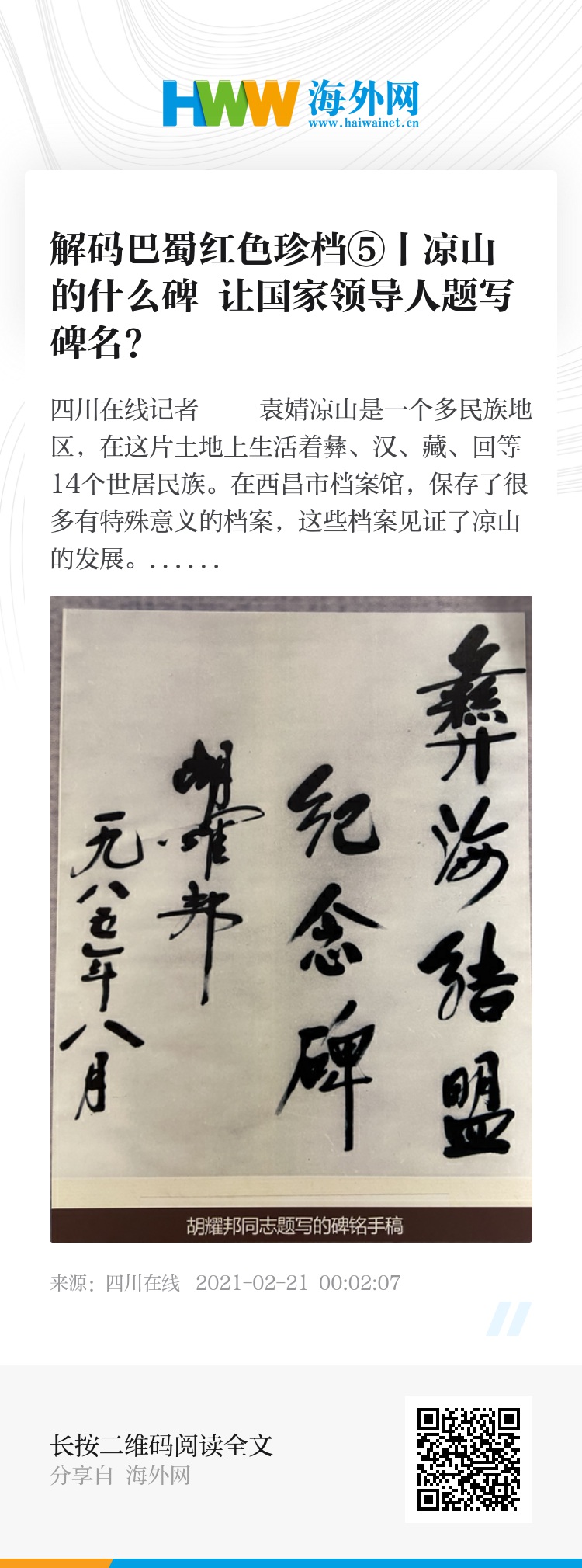 “其中最让人印象深刻的就是彝海结盟纪念碑的碑名真迹,它是时任中共中央总书记胡耀邦在1985年8月题写的,这份手稿原件存于馆内,是我们的镇馆之宝。”西昌市档案馆解说员付丹丹为我们展示了手稿原件的复制件。