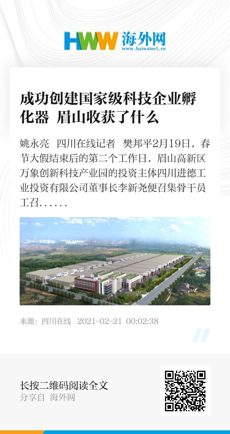 此前20余天,李新尧所站立的这片10万平米土地迎来了一块崭新的金字招牌——国家级科技企业孵化器。它的到来,终结了眉山没有国家级科技企业孵化器的历史,标志着在高新技术产业发展征程中,眉山迈出了最为关键的一步。