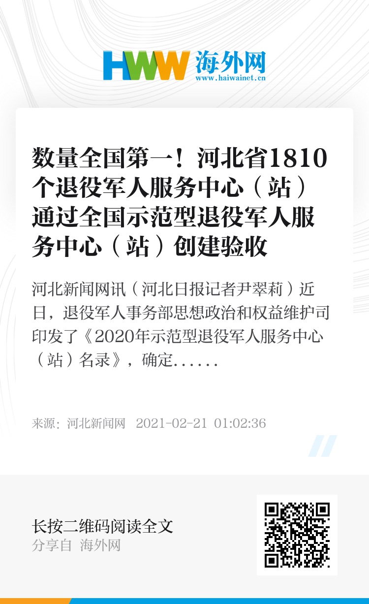 河北新闻网讯(河北日报记者尹翠莉)近日,退役军人事务部思想政治和权益维护司印发了《2020年示范型退役军人服务中心(站)名录》,确定全国2万多个退役军人服务中心(站)达到示范型标准,予以验收通过。其中,河北省1810个退役军人服务中心(站)通过验收,数量位居全国第一。