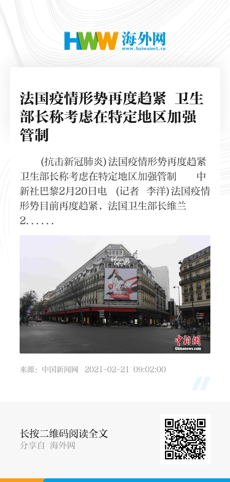 中新社巴黎2月20日电 (记者 李洋)法国疫情形势目前再度趋紧,法国卫生部长维兰20日表示最近的疫情数据不佳,并指出官方正考虑在特定地区加强管制措施。