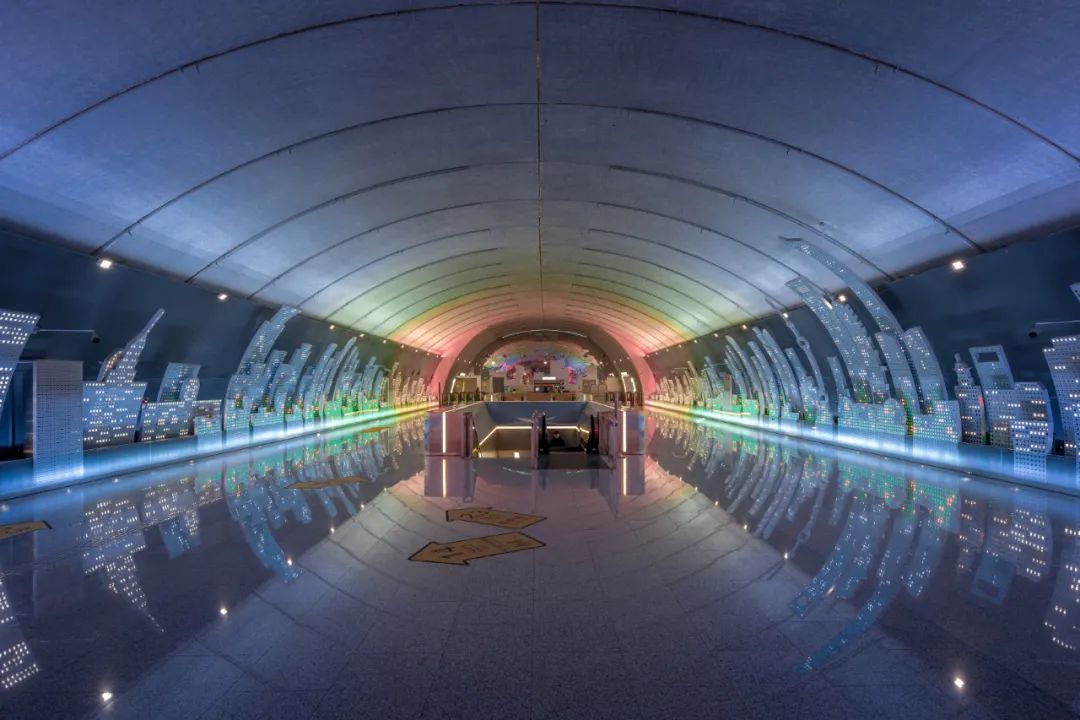 而论起地域文化和城市特色,早在2017年,广州就以一条“通往大海的地铁”走在了前列。广州地铁4号线南延长段,直奔大海,无缝接驳南沙邮轮母港。其中,南沙客运港站是一座围绕“岭南文化”为主题建造的车站。整个车站沉浸在一片海蓝色的色调中,全站铺设玻利维亚蓝花岗岩石材地板,天花板做镜面处理,让人仿佛置身通透的大海。