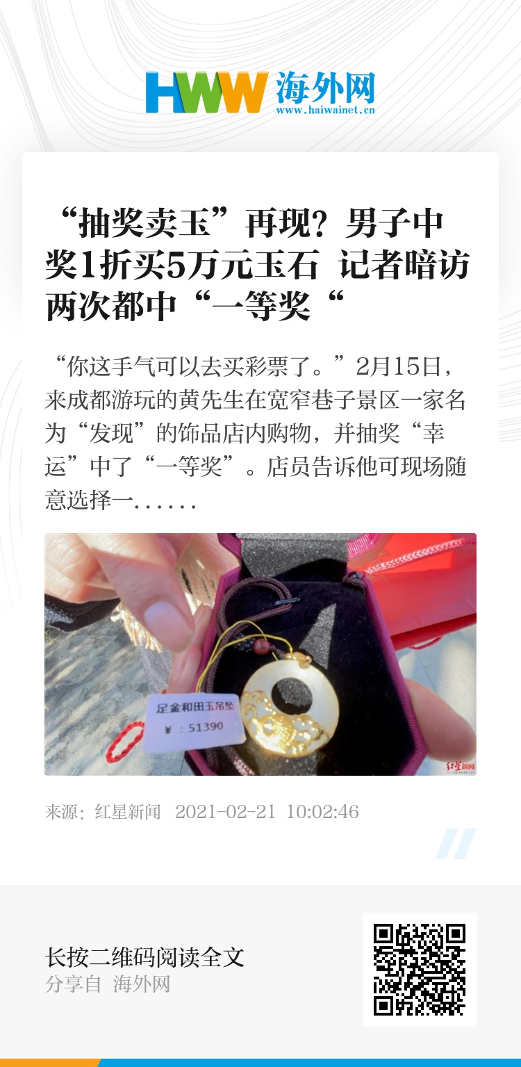 “你这手气可以去买彩票了。”2月15日,来成都游玩的黄先生在宽窄巷子景区一家名为“发现”的饰品店内购物,并抽奖“幸运”中了“一等奖”。店员告诉他可现场随意选择一款玉石免费带走,只需出10%左右的加工费。