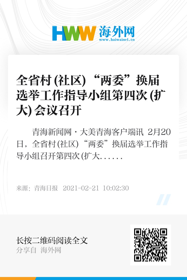 青海新闻网·大美青海客户端讯 2月20日,全省村(社区)“两委”换届选举工作指导小组召开第四次(扩大)会议,总结全省村(社区)换届工作,安排部署接续工作。省委常委、组织部长、指导小组组长王宇燕,省政府副省长、指导小组副组长匡湧出席。