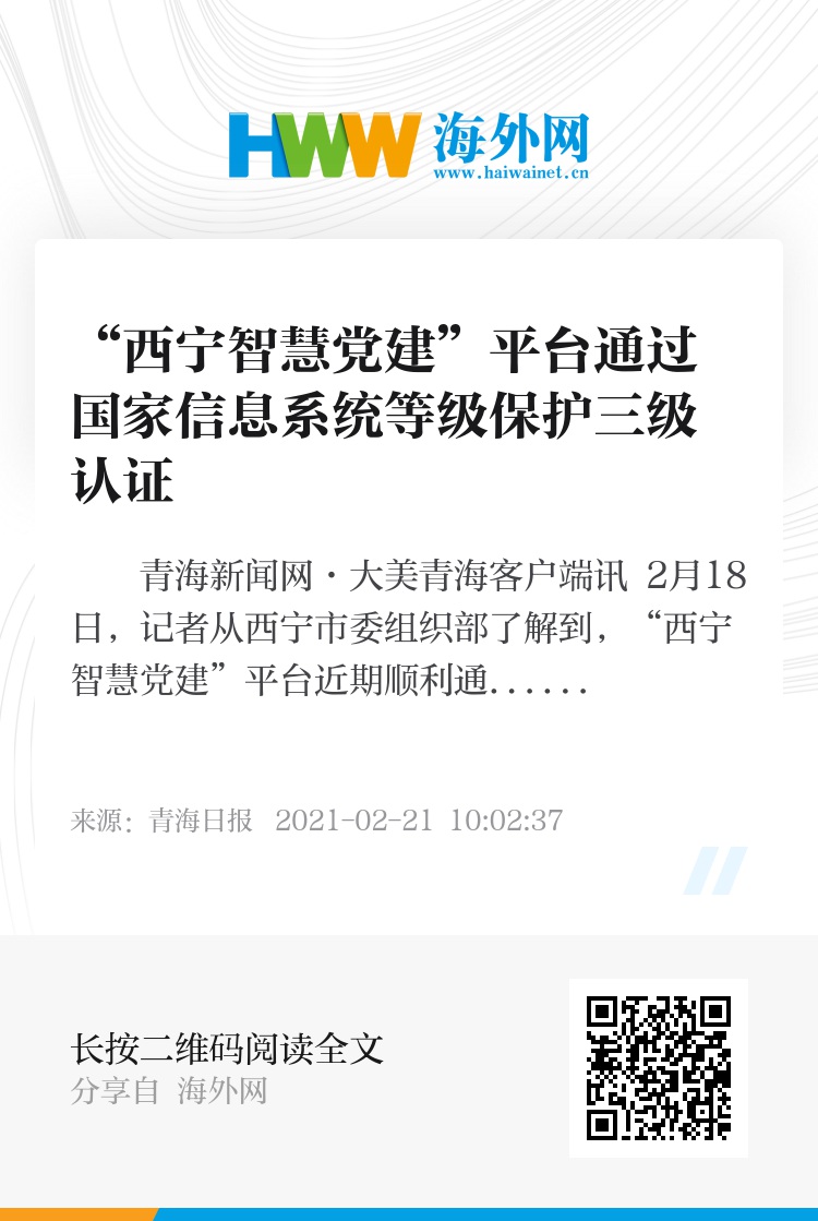 青海新闻网·大美青海客户端讯 2月18日,记者从西宁市委组织部了解到,“西宁智慧党建”平台近期顺利通过了国家信息系统等级保护三级测评,成功获得“等保三级”权威认证。