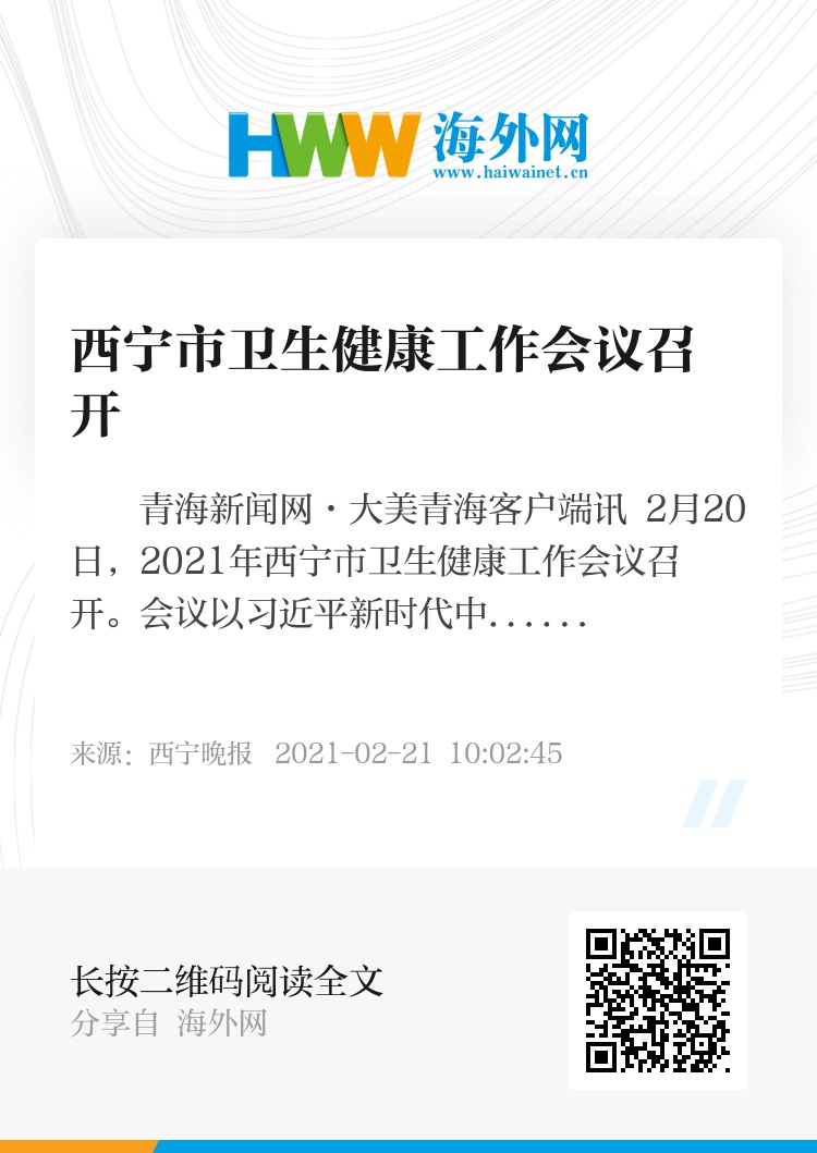 青海新闻网·大美青海客户端讯 2月20日,2021年西宁市卫生健康工作会议召开。会议以习近平新时代中国特色社会主义思想为指导,深入学习贯彻习近平总书记关于卫生健康和疫情防控工作的重要指示批示精神,按照全国卫生健康工作会议、省委十三届九次全会、全省卫生健康工作会议、市委十四届十二次全会要求,总结回顾工作,分析研判形势,谋划安排任务。会前,省委常委、市委书记陈瑞峰,市委副书记、市长张晓容分别对全市卫生健康工作提出要求。市领导韩生才出席会议并讲话。