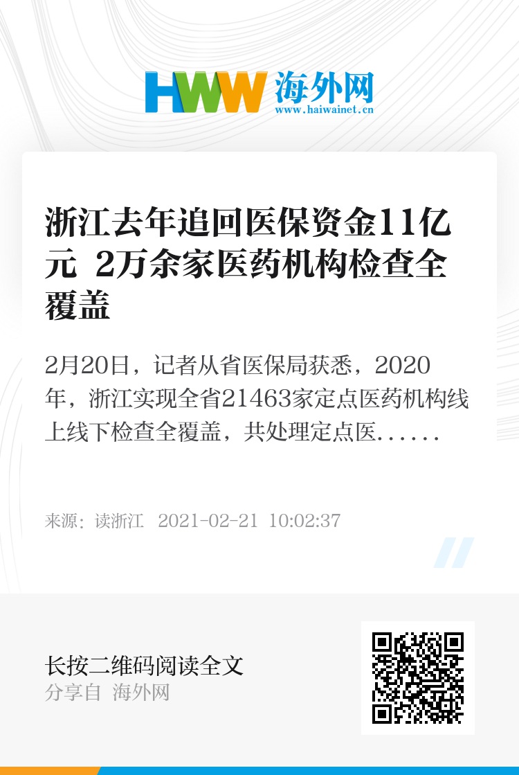 2月20日,记者从省医保局获悉,2020年,浙江实现全省21463家定点医药机构线上线下检查全覆盖,共处理定点医药机构18183家、参保人1257人,追回医保资金11亿元,同比增长240%,移送司法机关26家、参保人52人,公开曝光典型案例742件,是检查范围最广、打击力度最强、追回资金最多的一年。