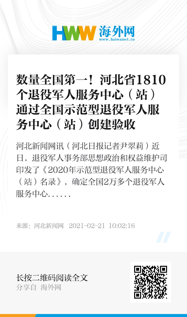 河北新闻网讯(河北日报记者尹翠莉)近日,退役军人事务部思想政治和权益维护司印发了《2020年示范型退役军人服务中心(站)名录》,确定全国2万多个退役军人服务中心(站)达到示范型标准,予以验收通过。其中,河北省1810个退役军人服务中心(站)通过验收,数量位居全国第一。