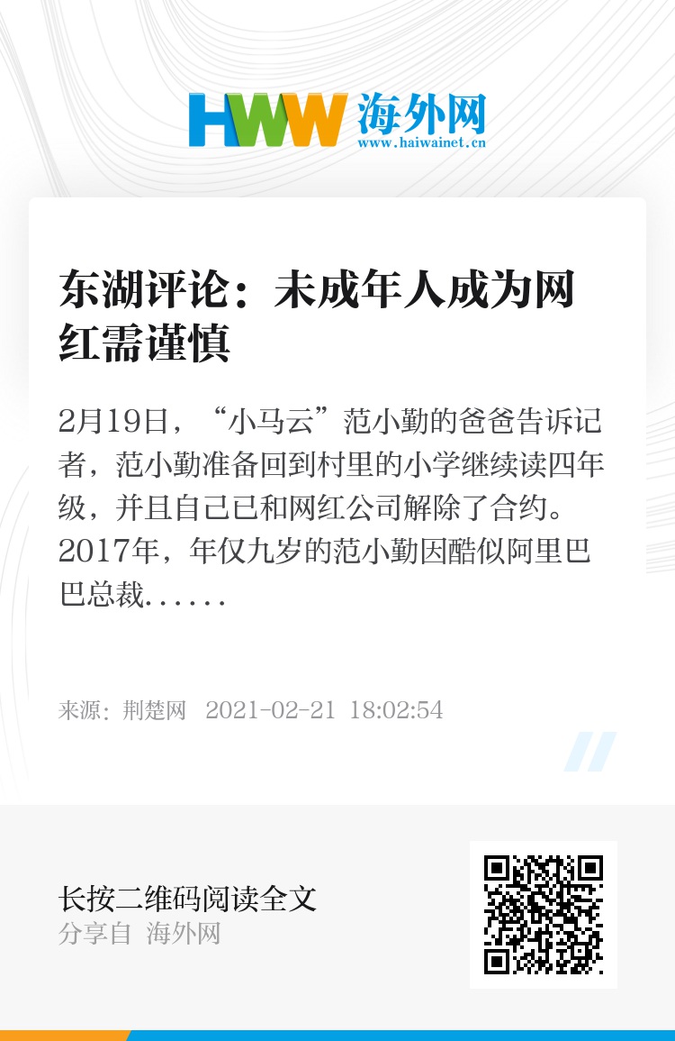 2月19日,“小马云”范小勤的爸爸告诉记者,范小勤准备回到村里的小学继续读四年级,并且自己已和网红公司解除了合约。2017年,年仅九岁的范小勤因酷似阿里巴巴总裁马云意外在各大网络平台上走红。在这次回村风波后,网友们纷纷表示,因为过气了就将孩子送回来的行为,是现在娱乐至死的最好解读。