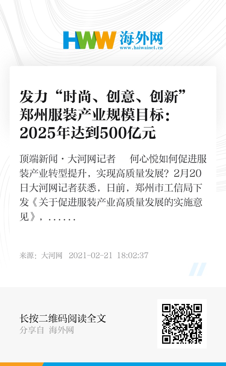 如何促进服装产业转型提升,实现高质量发展?2月20日大河网记者获悉,日前,郑州市工信局下发《关于促进服装产业高质量发展的实施意见》, 其中提到,到2025年,郑州服装产业规模将达到500亿元。