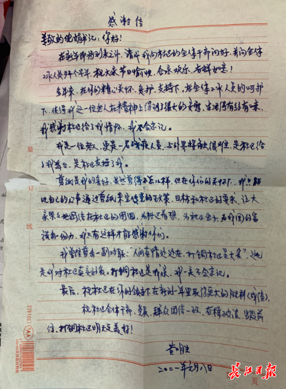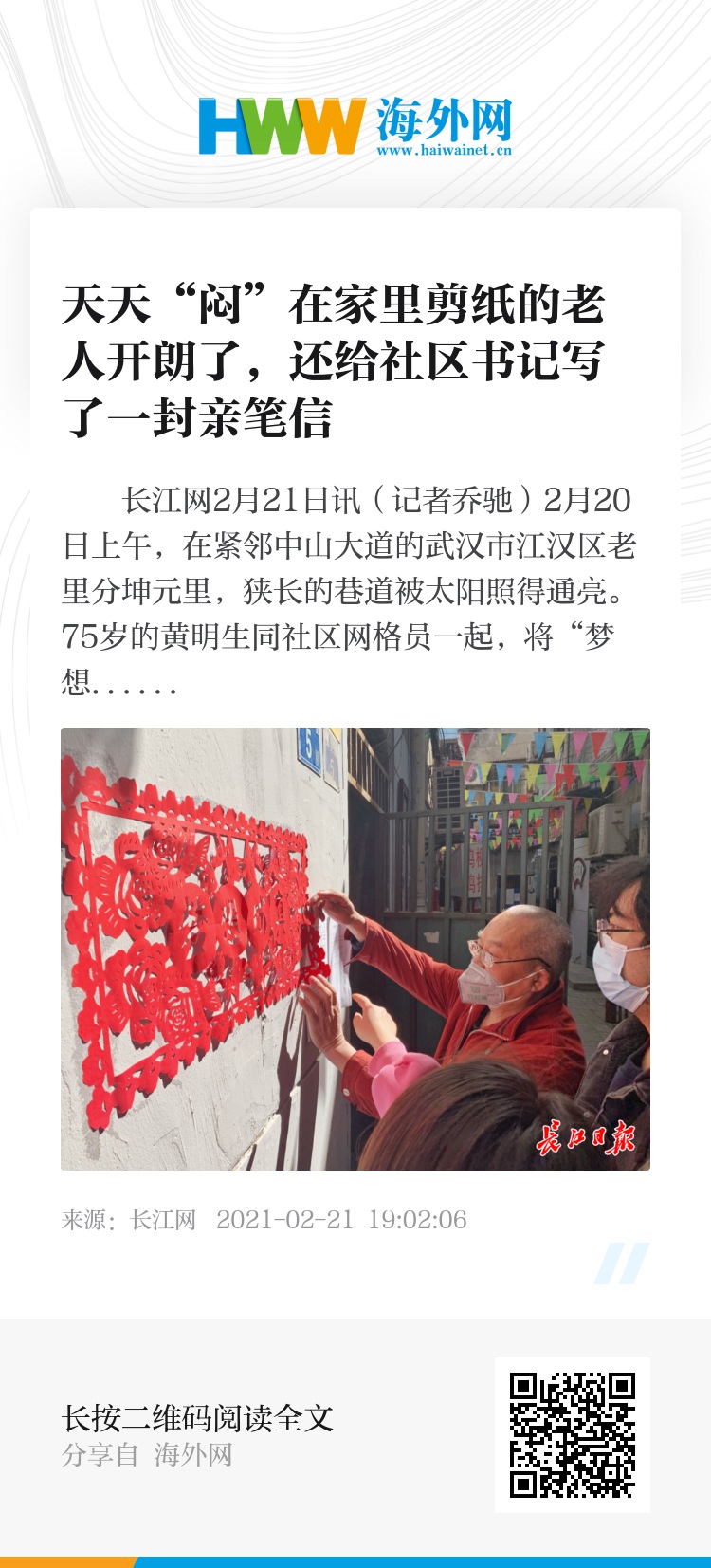 近几年,老两口虽然不住在打铜社区,但与社区的联系从未间断,凡是社区开展活动,两人一定主动赶来参与,还时不时给社区送来最新的剪纸作品。春节前,黄明生又特意送来了新剪的对联和墙花,除此之外,还附有一封写给倪娟的亲笔信,感谢社区多年来对自己的关心照顾,并祝愿社区工作在新的一年取得更好的成绩。
