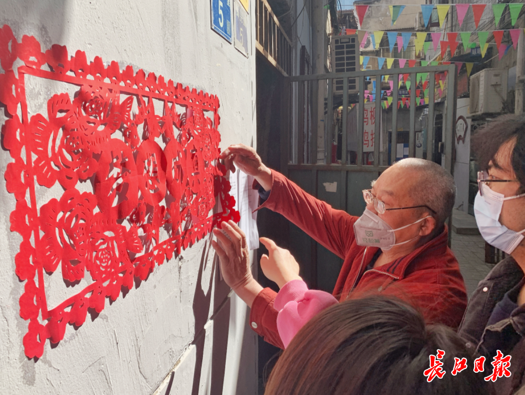 长江网2月21日讯(记者乔驰)2月20日上午,在紧邻中山大道的武汉市江汉区老里分坤元里,狭长的巷道被太阳照得通亮。75岁的黄明生同社区网格员一起,将“梦想成真”“福到我家”等充满美好寓意的剪纸,小心翼翼地贴在墙上。红彤彤的剪纸显得十分喜庆热闹,也给色彩单调的老里分增添了一抹亮色。