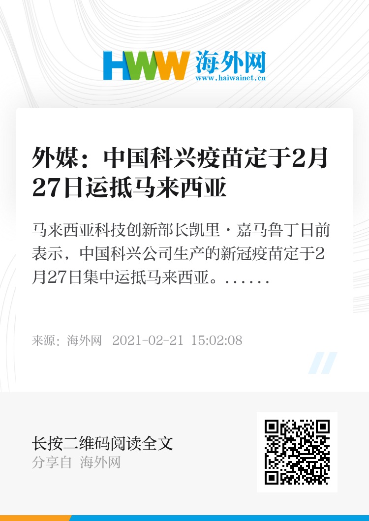 海外网2月21日电 据路透社21日报道,马来西亚科技创新部长凯里·嘉马鲁丁(Khairy Jamaluddin)日前表示,中国科兴公司生产的新冠疫苗定于2月27日集中运抵马来西亚,目前正等待当地监管部门批准。