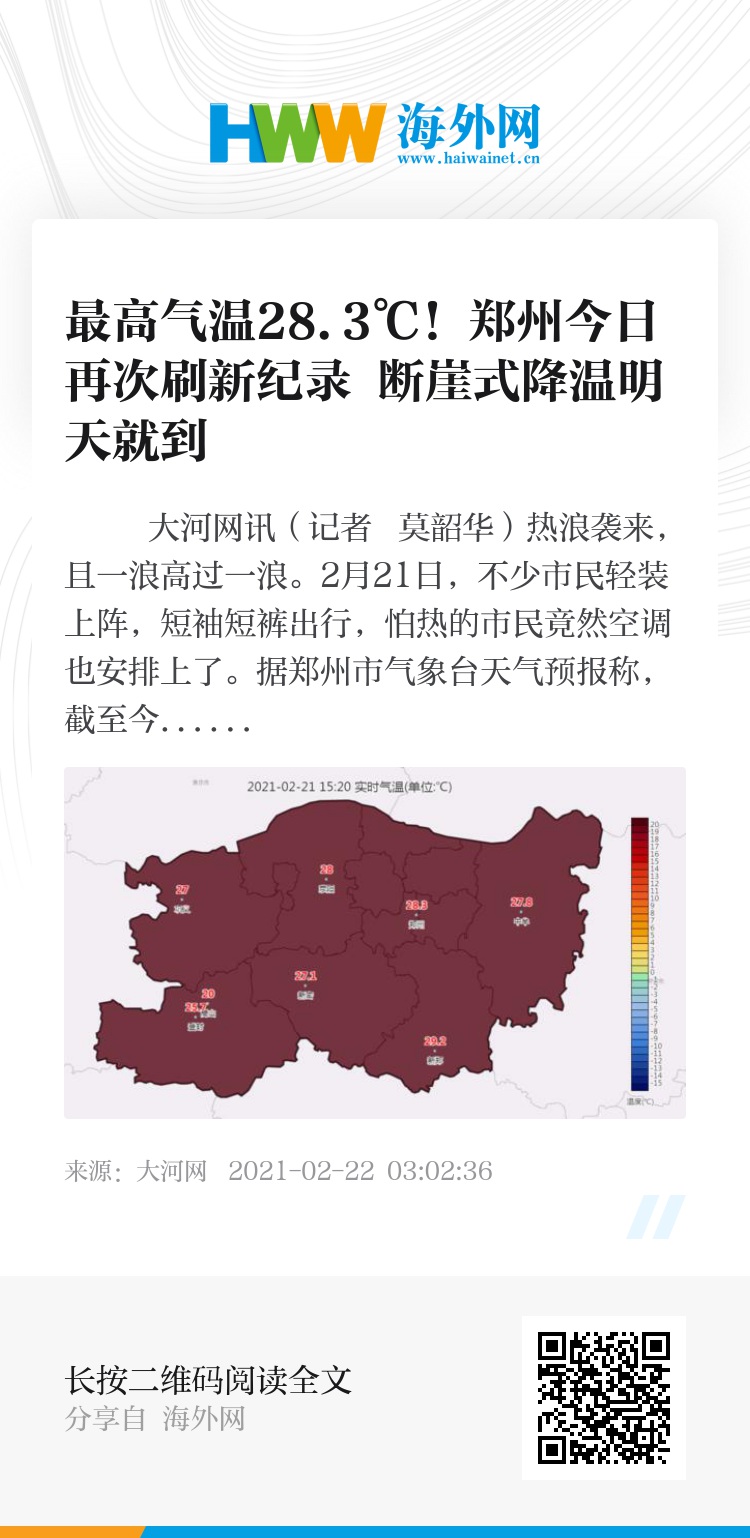 大河网讯(记者 莫韶华)热浪袭来,且一浪高过一浪。2月21日,不少市民轻装上阵,短袖短裤出行,怕热的市民竟然空调也安排上了。据郑州市气象台天气预报称,截至今天15时10分,郑州市区的最高气温已经达到28.3℃,刷新了昨天创下的郑州近70年2月份最高气温历史纪录。