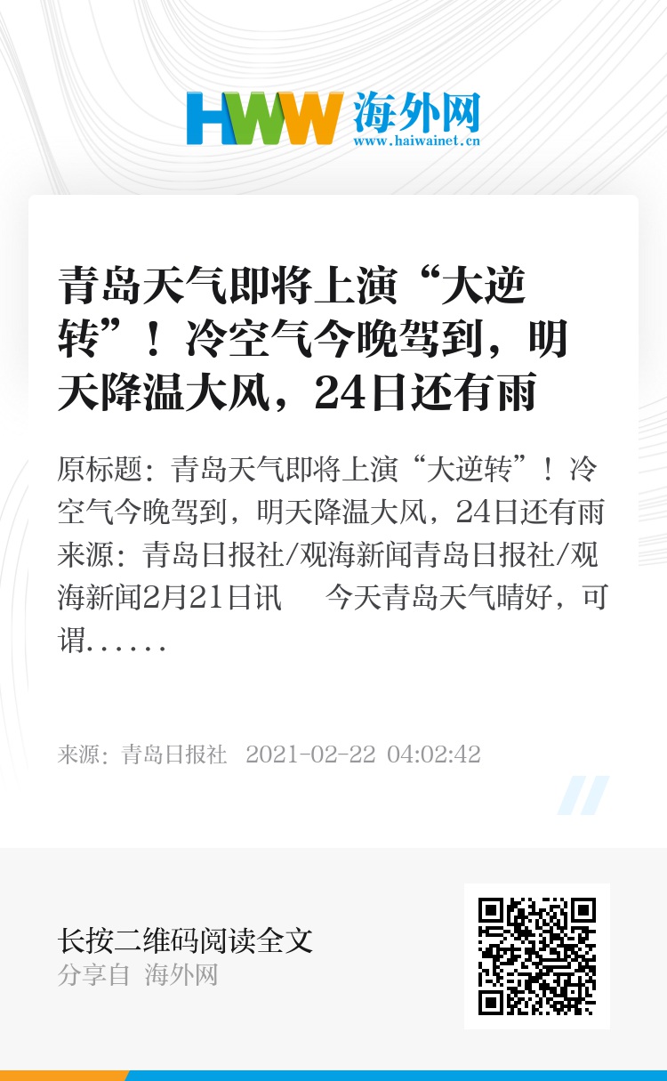 不过今晚冷空气就将驾到,大风降温再次现身。为此青岛市气象台2021年02月21日14时50分发布大风蓝色预警信号:受较强冷空气影响,预计明天早晨到夜间,我市北风风力逐渐增大,内陆地区可达4到5级阵风7级,沿海地区5到6级阵风8级,近海海域7到8级阵风9级,请注意防范。