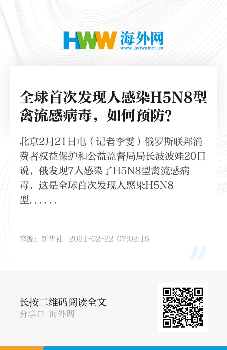 新华社北京2月21日电(记者李雯)俄罗斯联邦消费者权益保护和公益监督局局长波波娃20日说,俄发现7人感染了H5N8型禽流感病毒,这是全球首次发现人感染H5N8型禽流感病毒。迄今医学界已发现不止一种禽流感病毒可传染给人,人们应该如何预防?