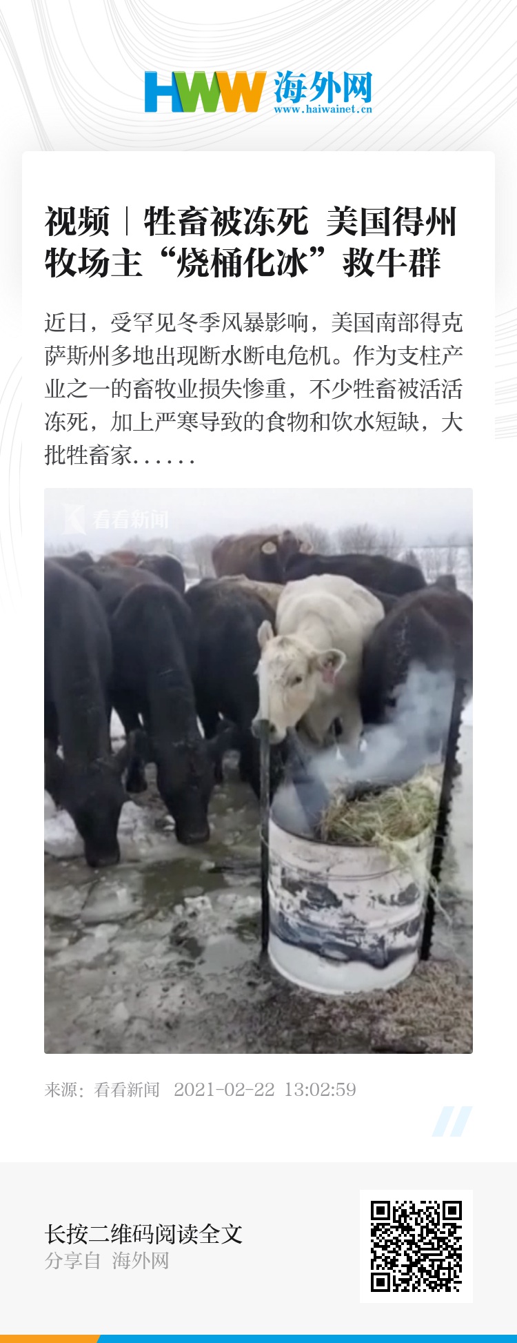 近日,受罕见冬季风暴影响,美国南部得克萨斯州多地出现断水断电危机。作为支柱产业之一的畜牧业损失惨重,不少牲畜被活活冻死,加上严寒导致的食物和饮水短缺,大批牲畜家禽生存条件急剧恶化。为此,当地一些牧场主不得不“就地取材”,化冰取水,既解决了动物取暖的问题,又找到了水源。