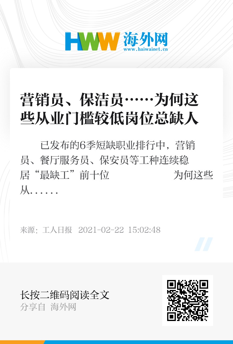 已发布的6季短缺职业排行中,营销员、餐厅服务员、保安员等工种连续稳居“最缺工”前十位