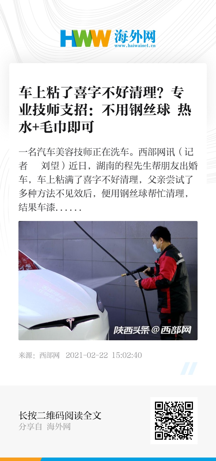 车上粘贴的喜字,究竟该怎么处理呢?西部网、陕西头条客户端记者今天(2月22日)走访了多家汽车美容店,工程师也给出了统一回答——多用热水和毛巾。据了解,车上粘贴喜字的方式一般分两种,一种是靠不干胶等物质粘贴,一种是靠静电粘贴。