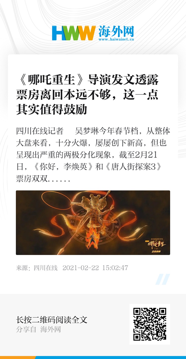 2月21日晚,《新神榜:哪吒重生》导演赵霁发布长文,透露影片票房虽已突破3亿,但离回本还远远不够,也感叹做动画不容易,由于由于预算和时间的限制,许多镜头和设想不得不被砍掉。