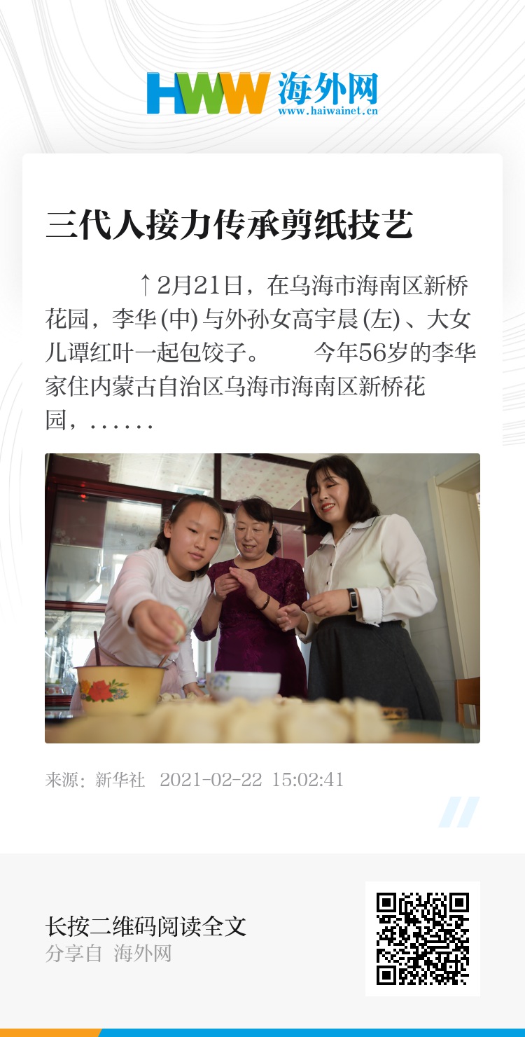 今年春节,李华一家三代人一起剪纸,用不同的作品迎接新春。“我想通过我们三代人的接力,带动亲人朋友学习剪纸,让剪纸技艺传承下去。”李华说。