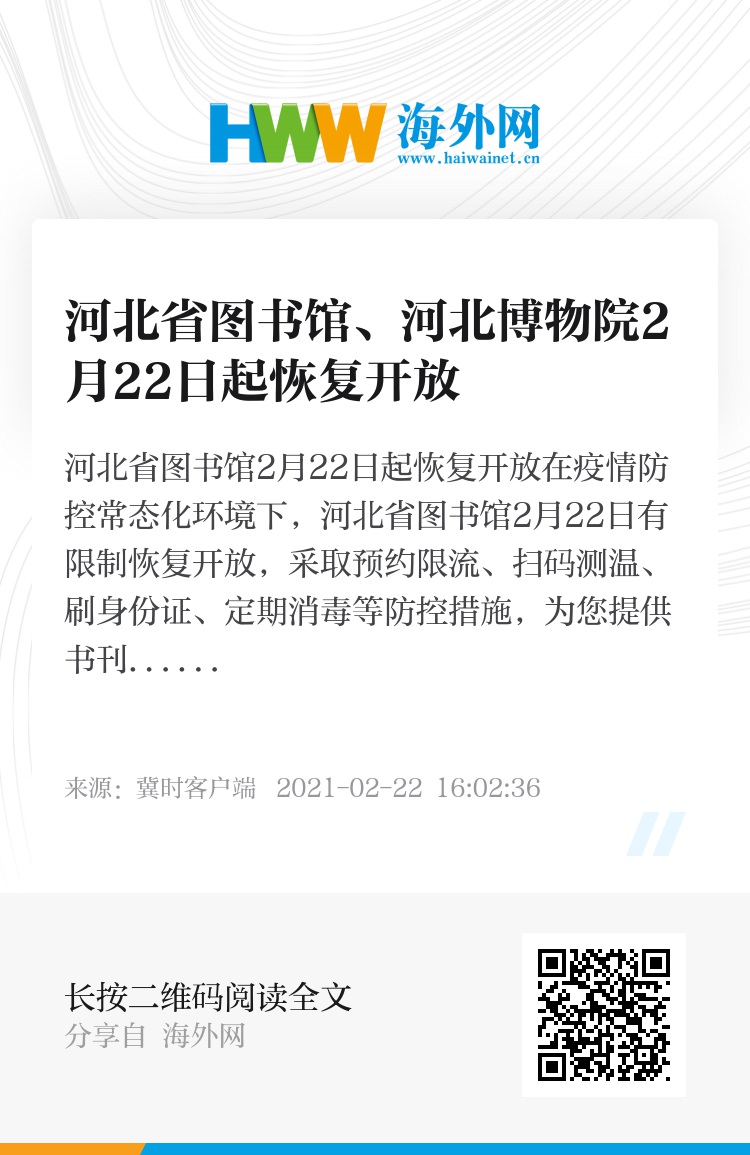在疫情防控常态化环境下,河北省图书馆2月22日有限制恢复开放,采取预约限流、扫码测温、刷身份证、定期消毒等防控措施,为您提供书刊借还和报纸阅览服务。