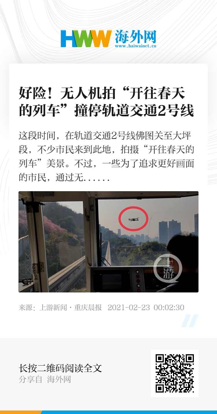 2月22日下午,微博网友“穿10号球衣的巴乔”在网上发布了一段无人机撞上2号线单轨列车的视频。在这段2分50秒的视频当中,视频拍摄者正在2号线列车驾驶室与车厢之间的窗口拍摄列车行进的画面。根据视频内容可以得知,该列车此时正行进在佛图关至大坪段,沿线也有不少人群正在拍摄鲜花映衬下的列车。