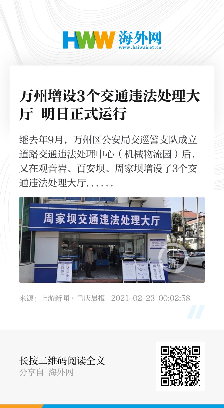 继去年9月,万州区公安局交巡警支队成立道路交通违法处理中心(机械物流园)后,又在观音岩、百安坝、周家坝增设了3个交通违法处理大厅,于明(23)日正式运行。