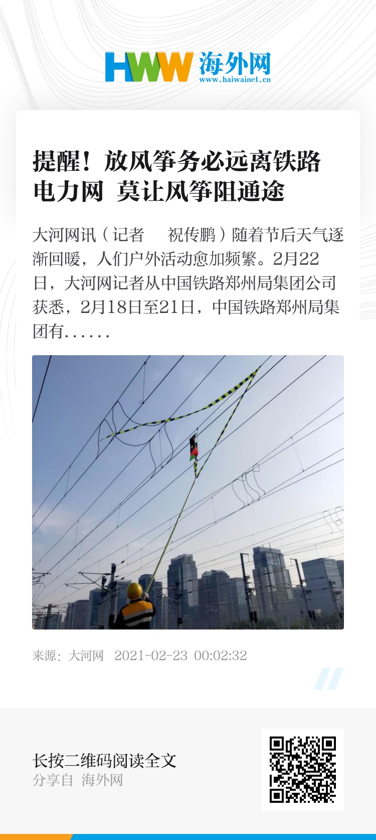 铁路部门提示,根据《铁路安全管理条例》和《河南省铁路安全管理规定》,禁止在铁路电力线路导线两侧各500米范围内升放风筝、气球等低空飘浮物体。如违反相关规定,由公安机关责令改正,并对单位处1万元以上5万元以下的罚款,对个人处500元以上2000元以下的罚款。