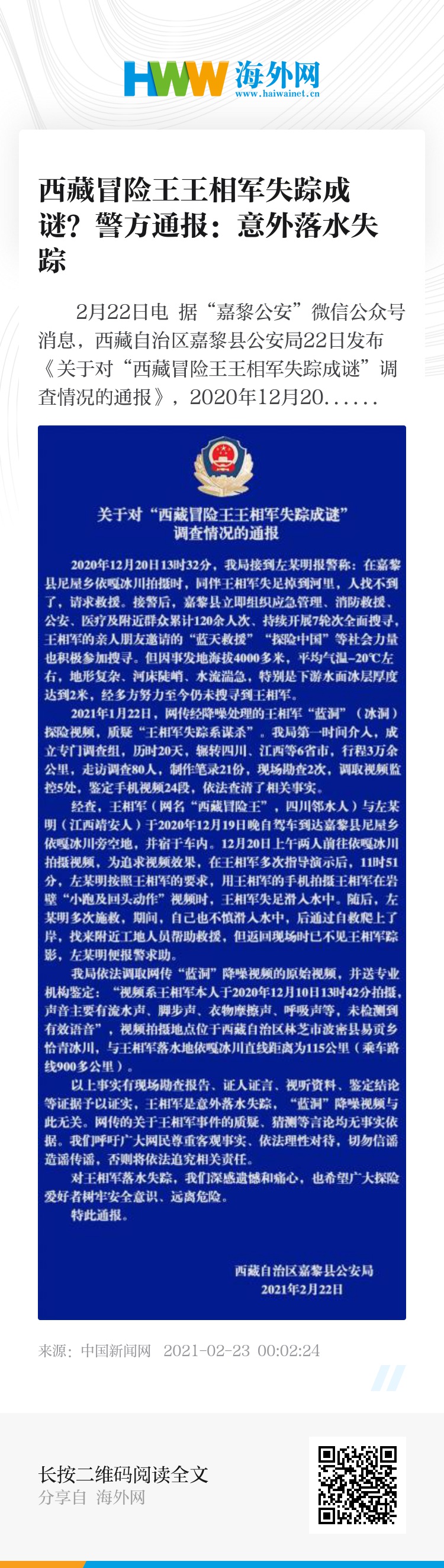 中新网2月22日电 据“嘉黎公安”微信公众号消息,西藏自治区嘉黎县公安局22日发布《关于对“西藏冒险王王相军失踪成谜”调査情况的通报》,2020年12月20日13时32分,嘉黎县公安局接到左某明报警称:在嘉黎县尼屋乡依嘎冰川拍摄时,同伴王相军失足掉到河里,人找不到了,请求救援。接警后,嘉黎县立即组织应急管理、消防救援、公安、医疗及附近群众累计120余人次、持续开展7轮次全面搜寻,王相军的亲人朋友邀请的“蓝天救援”“探险中国”等社会力量也积极参加搜寻。但因事发地海拔4000多米,平均气温-20℃左右,地形复杂、河床陡峭、水流湍急,特别是下游水面冰层厚度达到2米,经多方努力至今仍未搜寻到王相军。