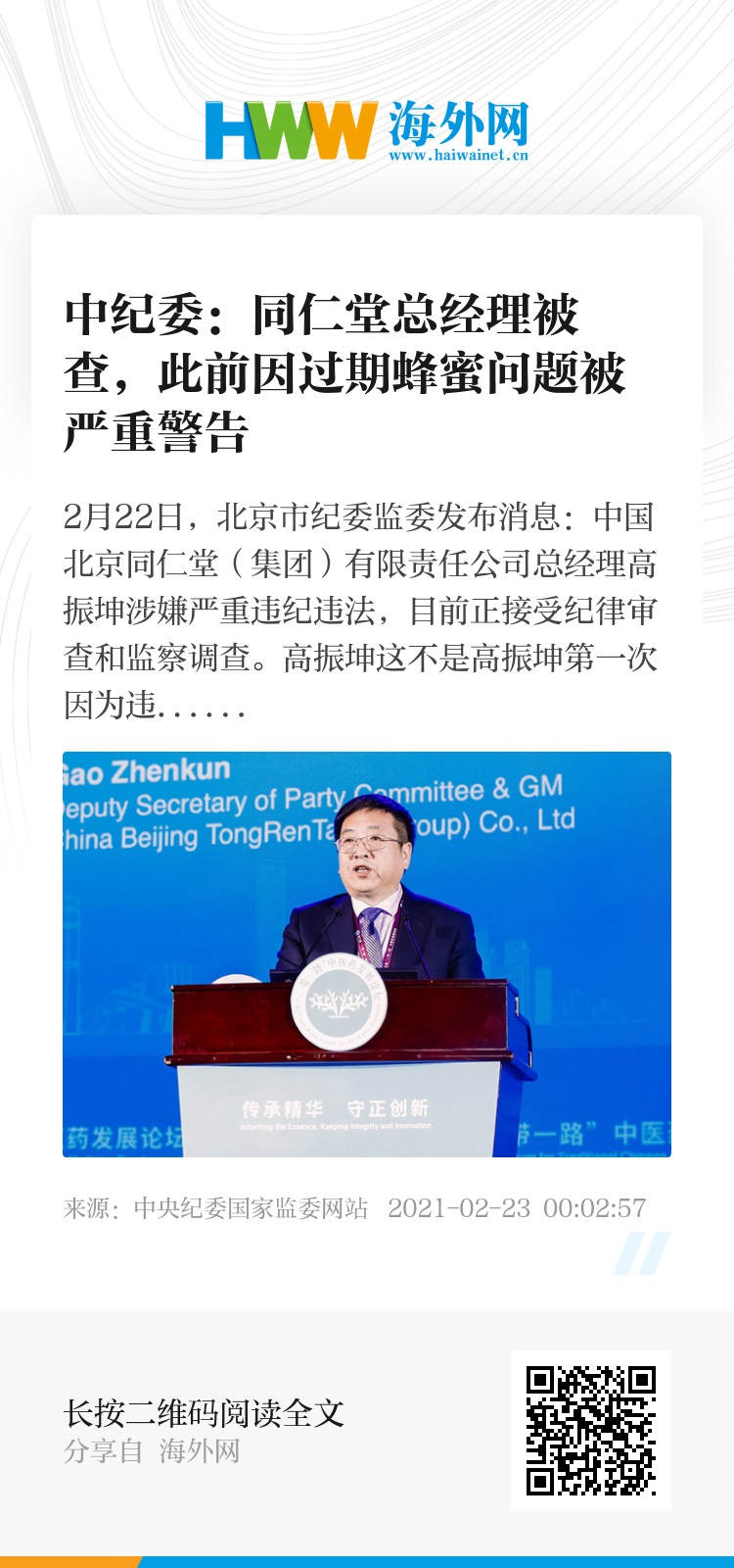 31987151,.中纪委:同仁堂总经理被查,此前因过期蜂蜜问题被严重警告,.2021-02-23 00:55:57,.3139,.海闻