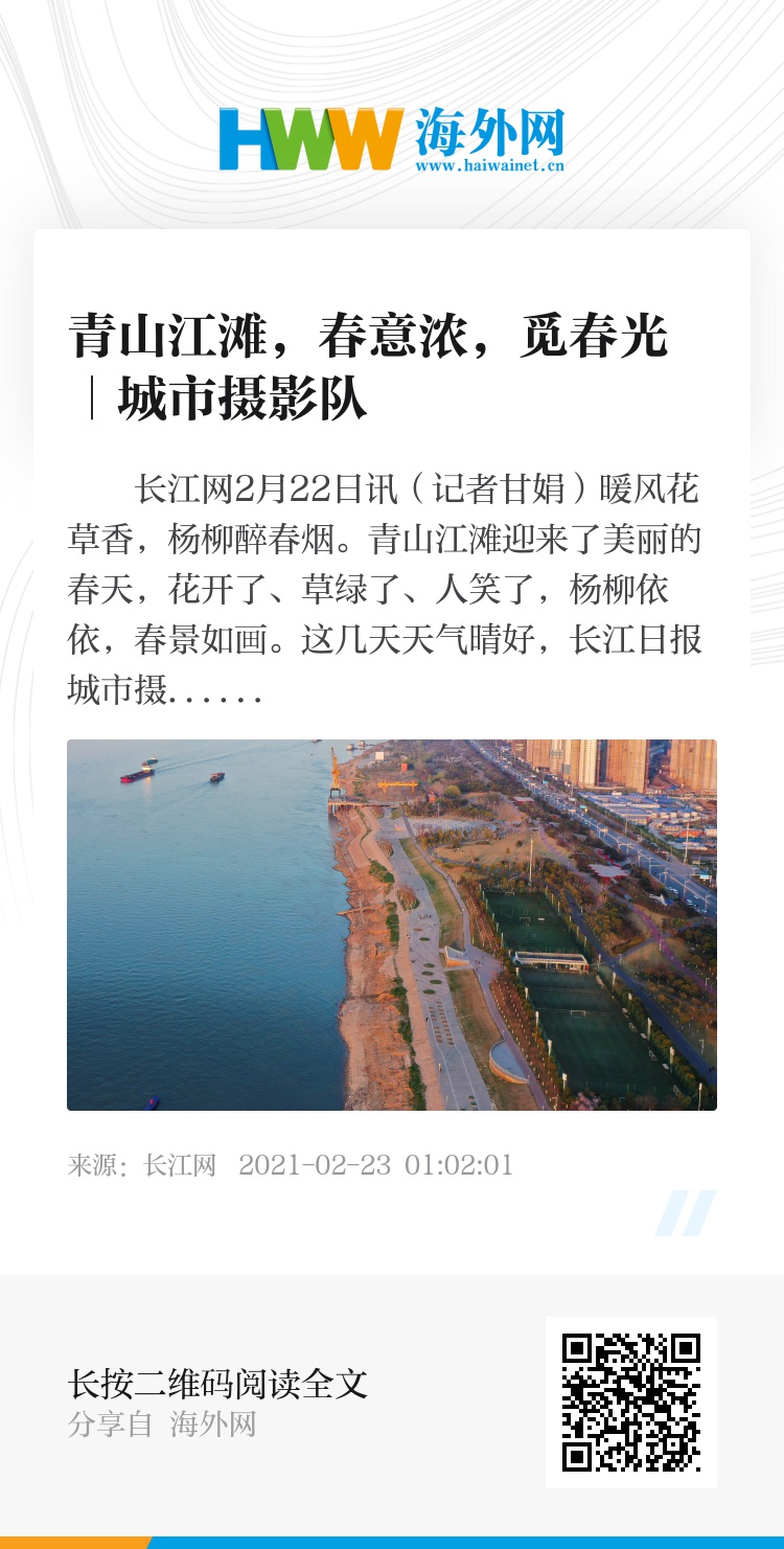 长江网2月22日讯(记者甘娟)暖风花草香,杨柳醉春烟。青山江滩迎来了美丽的春天,花开了、草绿了、人笑了,杨柳依依,春景如画。这几天天气晴好,长江日报城市摄影队的摄影师记录了青山江滩的春天美景,无人机航拍青山江滩的壮美、人与花相映成趣的生活、湛蓝天空下的风筝追月、大吊机“工业风”的城市景观,一一被定格。