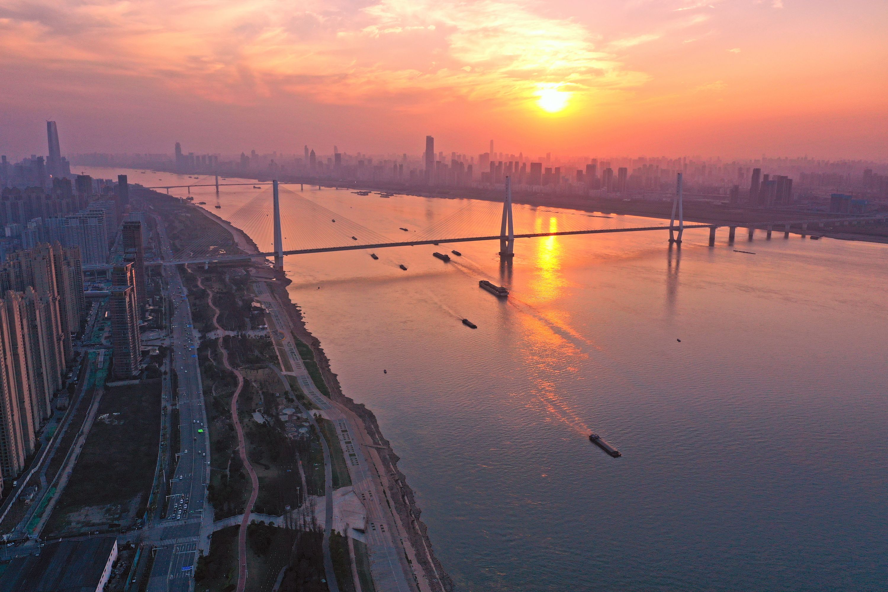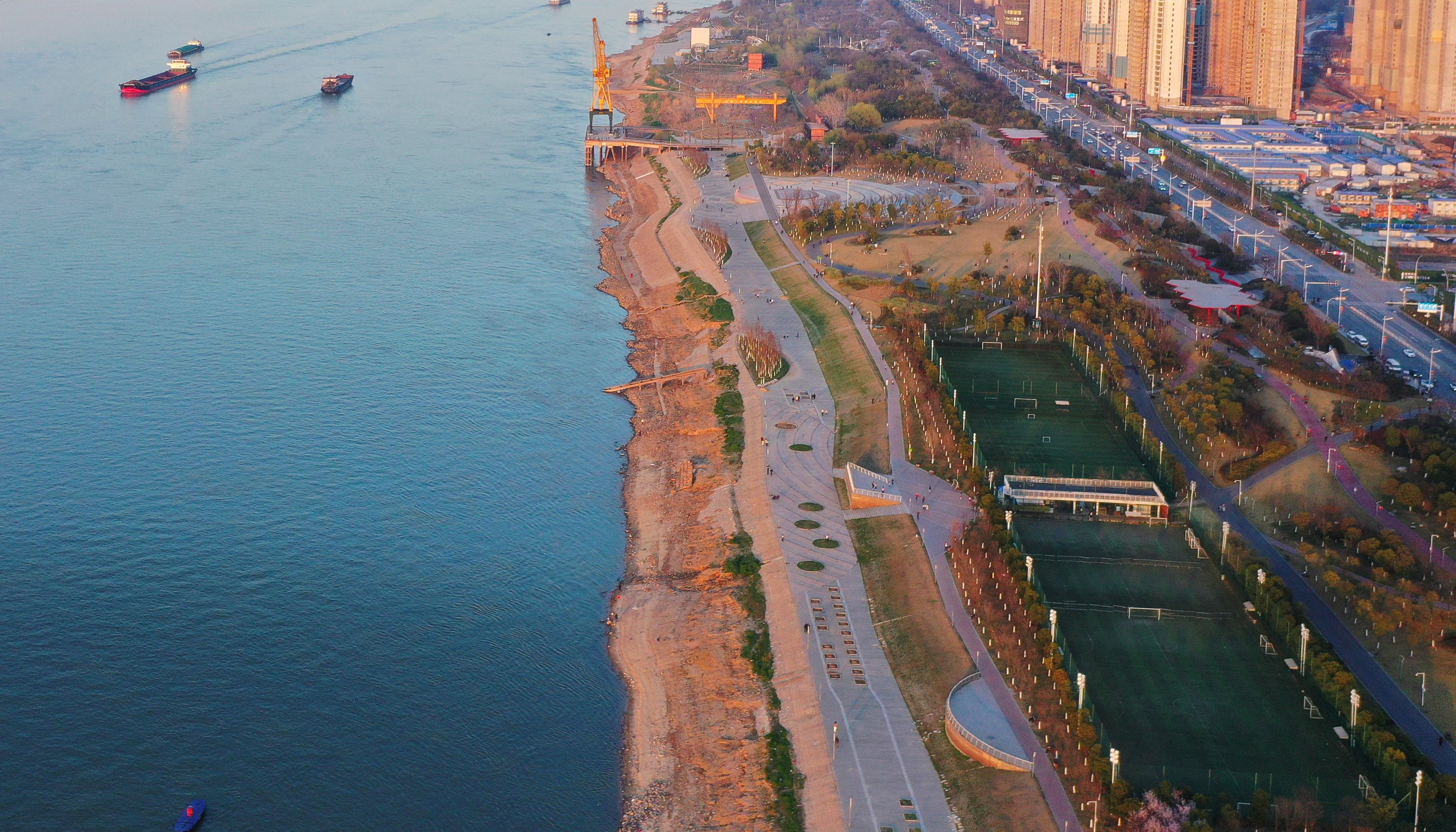 青山江滩是武汉市首个“江、滩、城”三位一体的生态江滩,是湖北省首个“海绵”江滩,绿化率达到80%。青山江滩长7.5公里,分为体育运动景观区、都市时尚景观区、工业遗迹景观区等七大景观区。无人机从空中俯瞰,江水、绿地、高楼、沙滩,一派春天的生机勃勃。