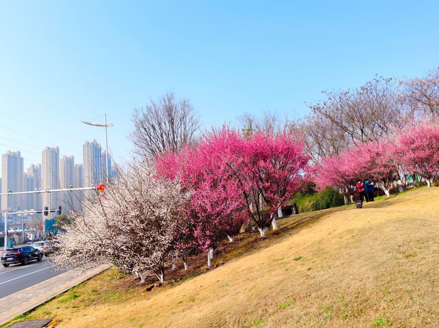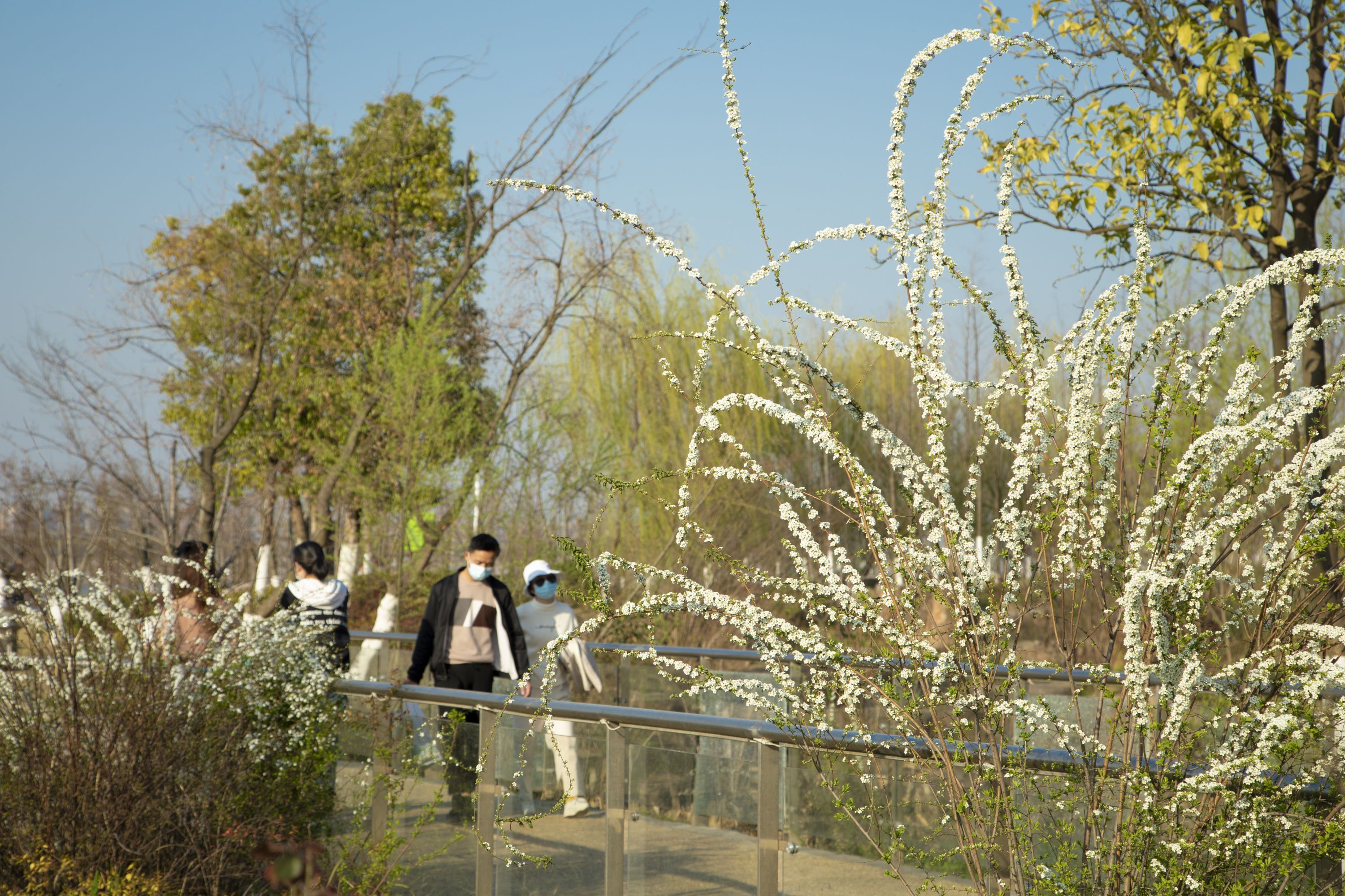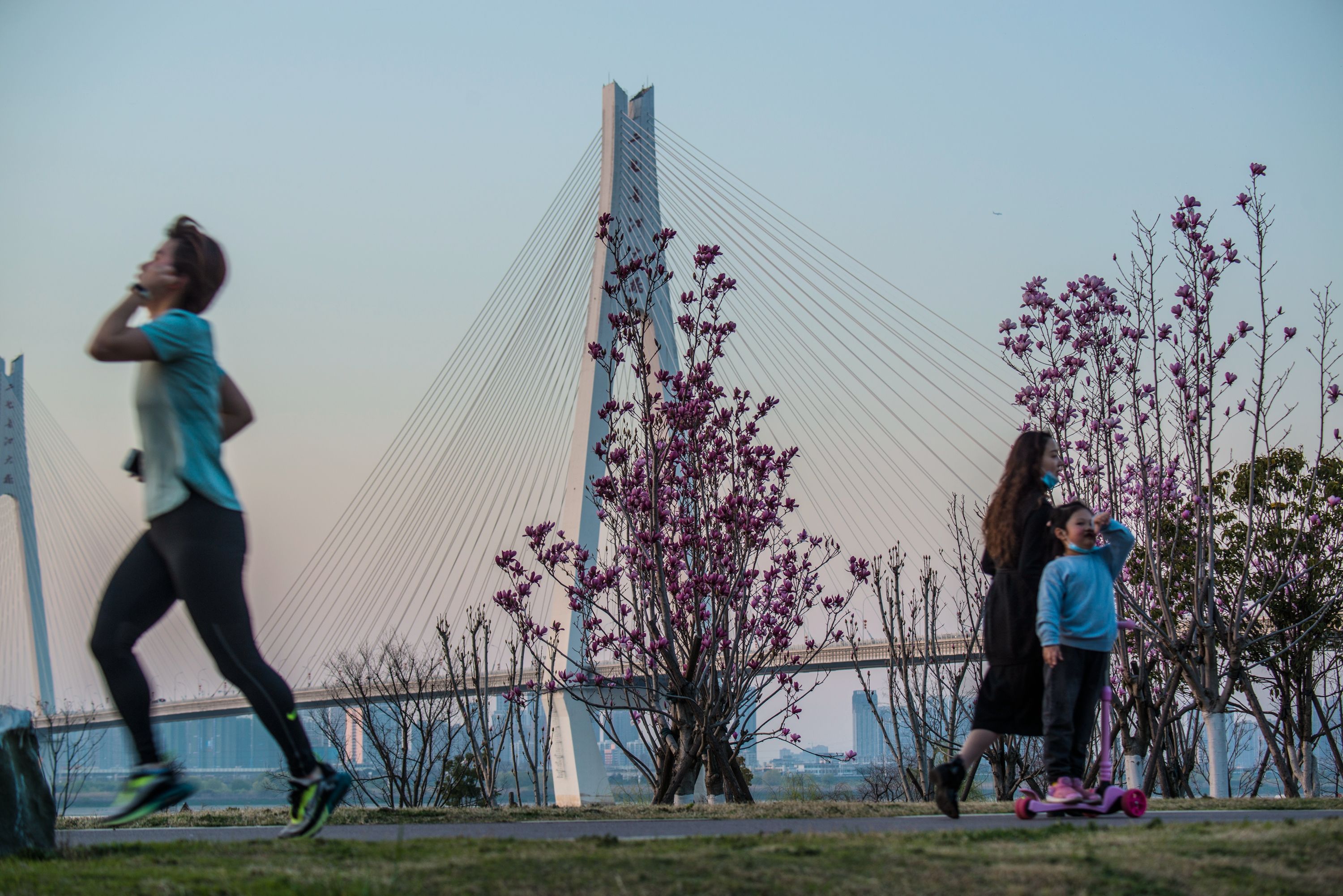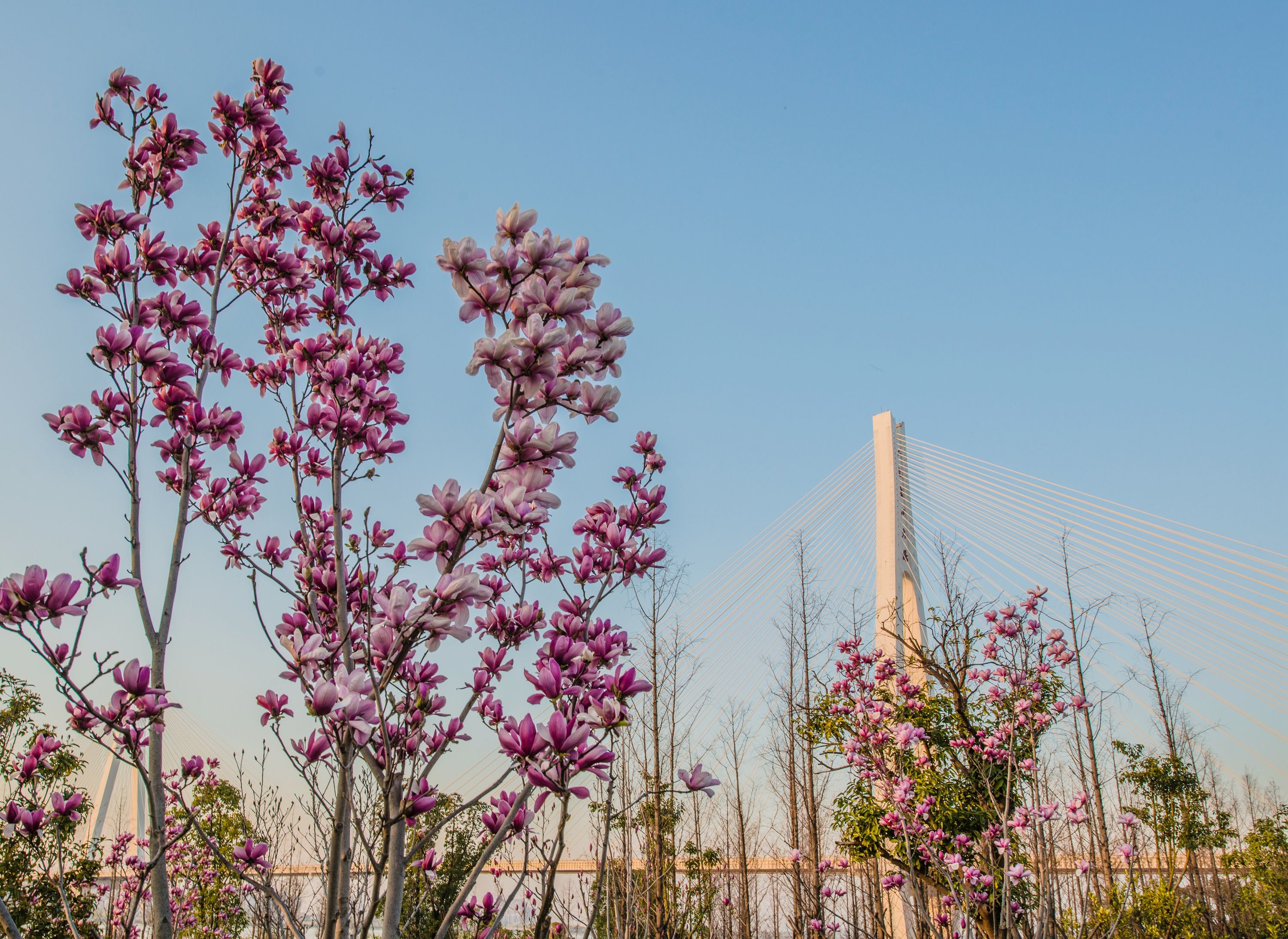 春日暖洋洋,市民来到青山江滩享受春光,享受生活。江滩处处春意浓,垂柳抽出新枝,白玉兰、红叶李、紫叶李满树花开,映照在湛蓝天空下。二七长江大桥在盛开的玉兰花映衬下,格外壮美。部分早樱已经开放,更多的樱花树上满满的花苞,摄影师“风姿”说,再过一周左右,樱花就要盛开了,那时会更美。
