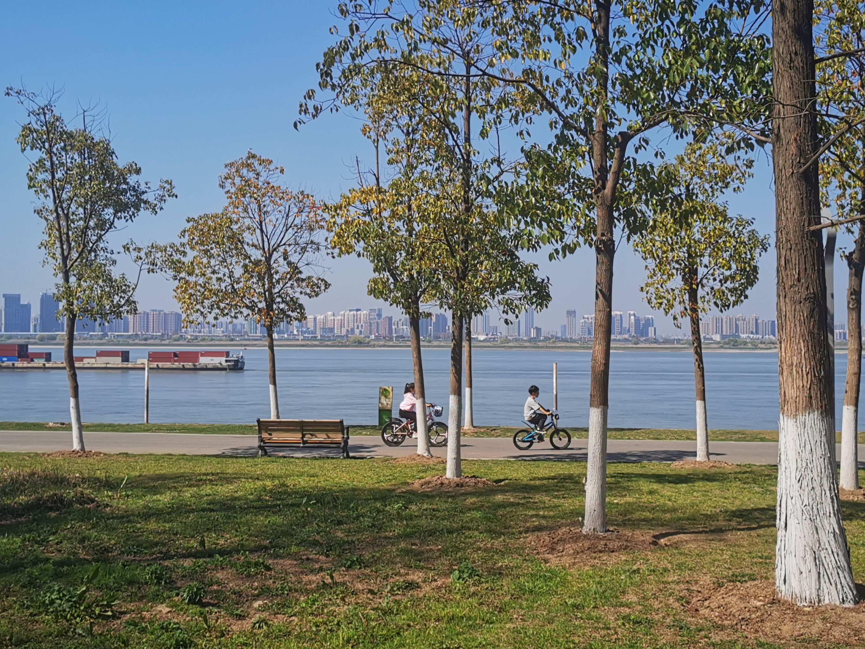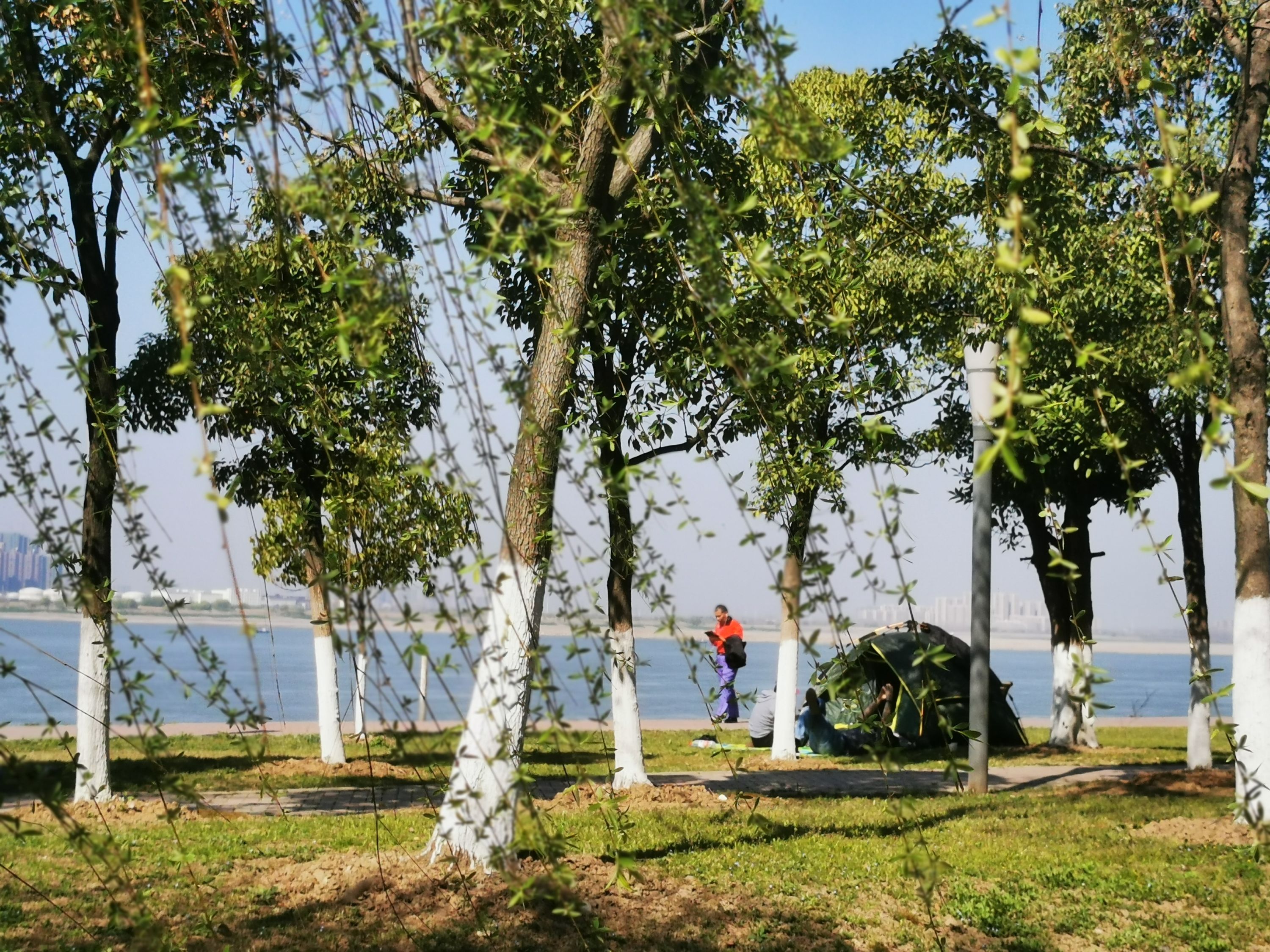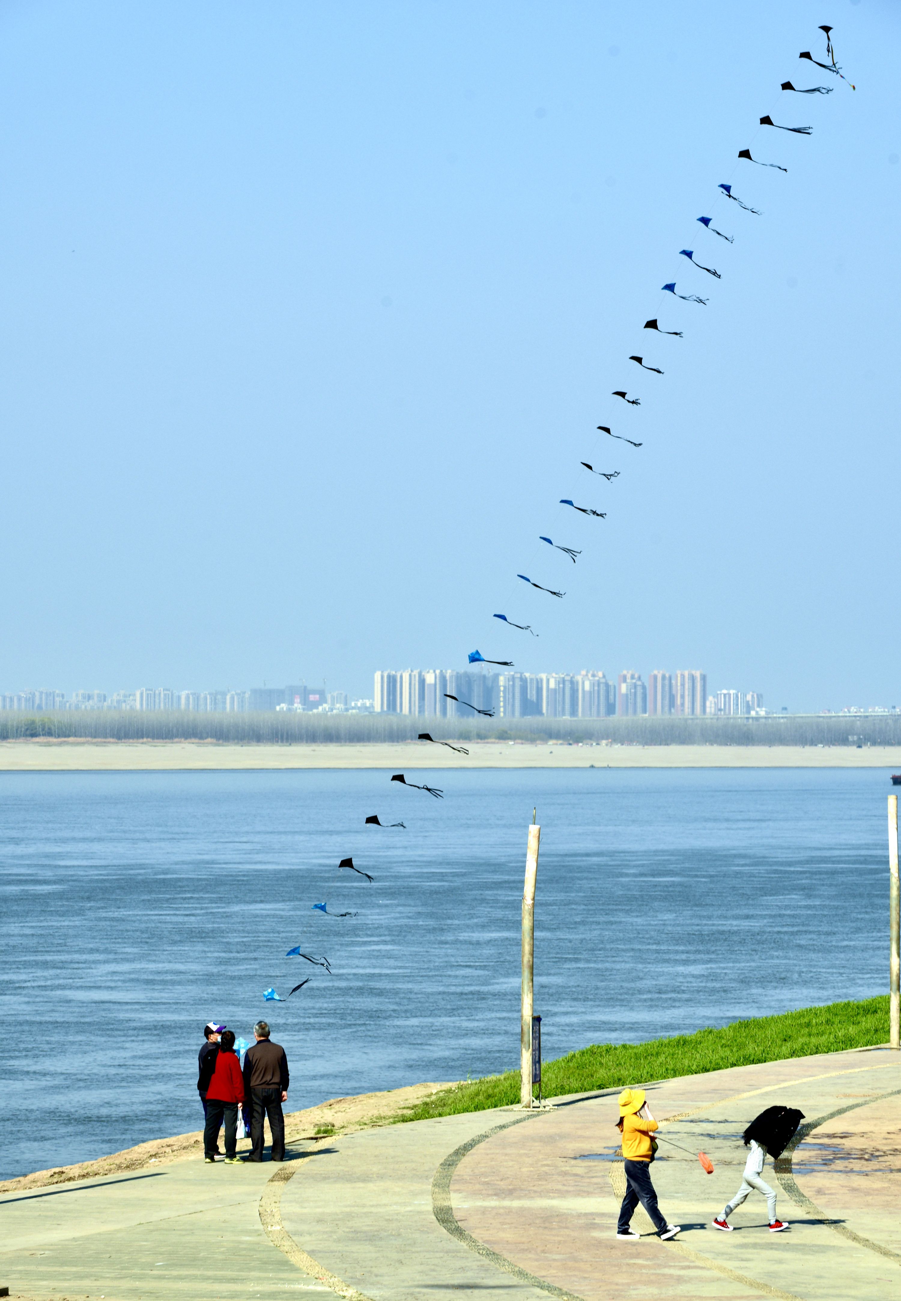 中午气温升高,在青山江滩游玩的人们撑起了遮阳伞,在树荫下搭起帐篷,吹江风、看江景、放风筝、骑单车……悠闲自得。21日下午,摄影师“江海生”从青山江滩公园大门进去,很多市民在江滩上放风筝,住在附近的一对老夫妇放起了200多米长的风筝,吸引了很多游客。江面上波光粼粼,还有桨板爱好者在江中滑行。