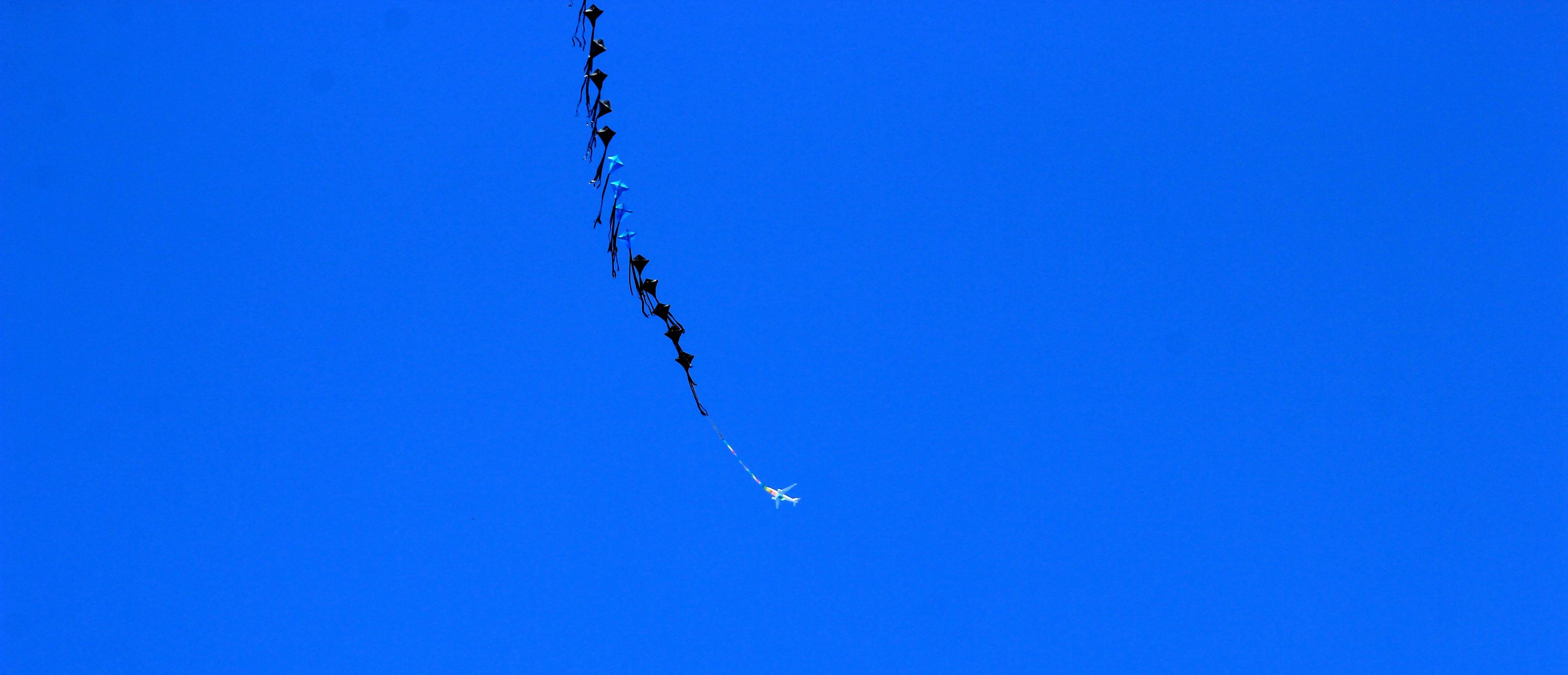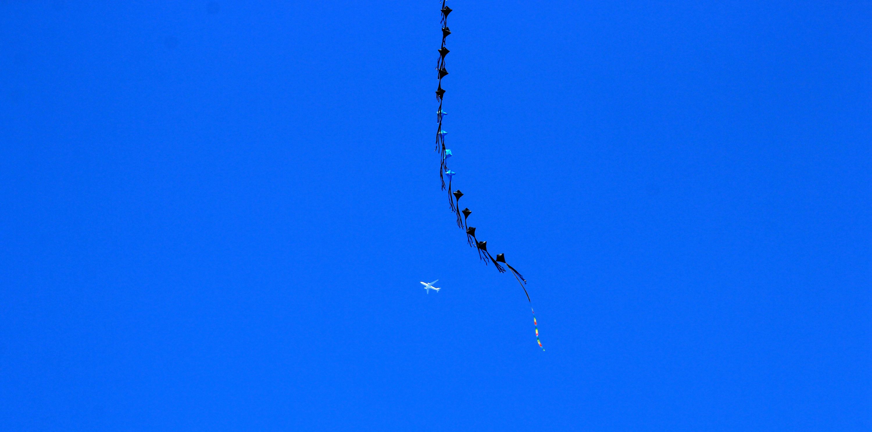 风筝的尾巴后,一架飞机飞过。城市摄影队林林 摄