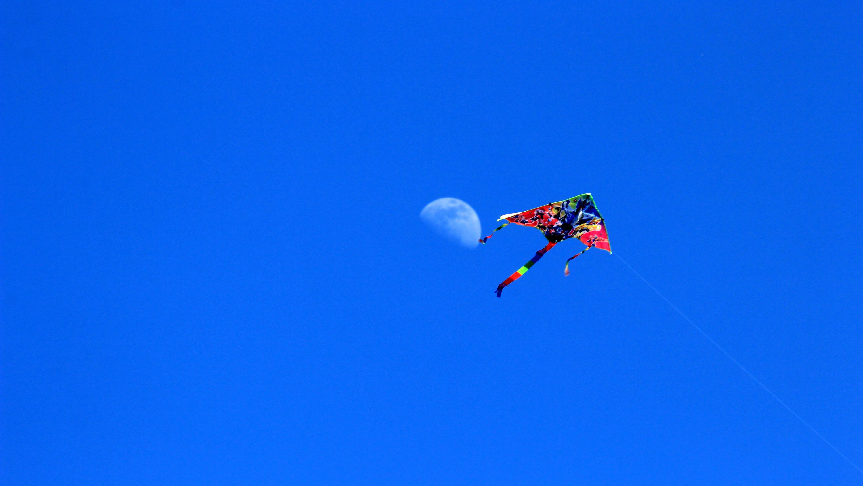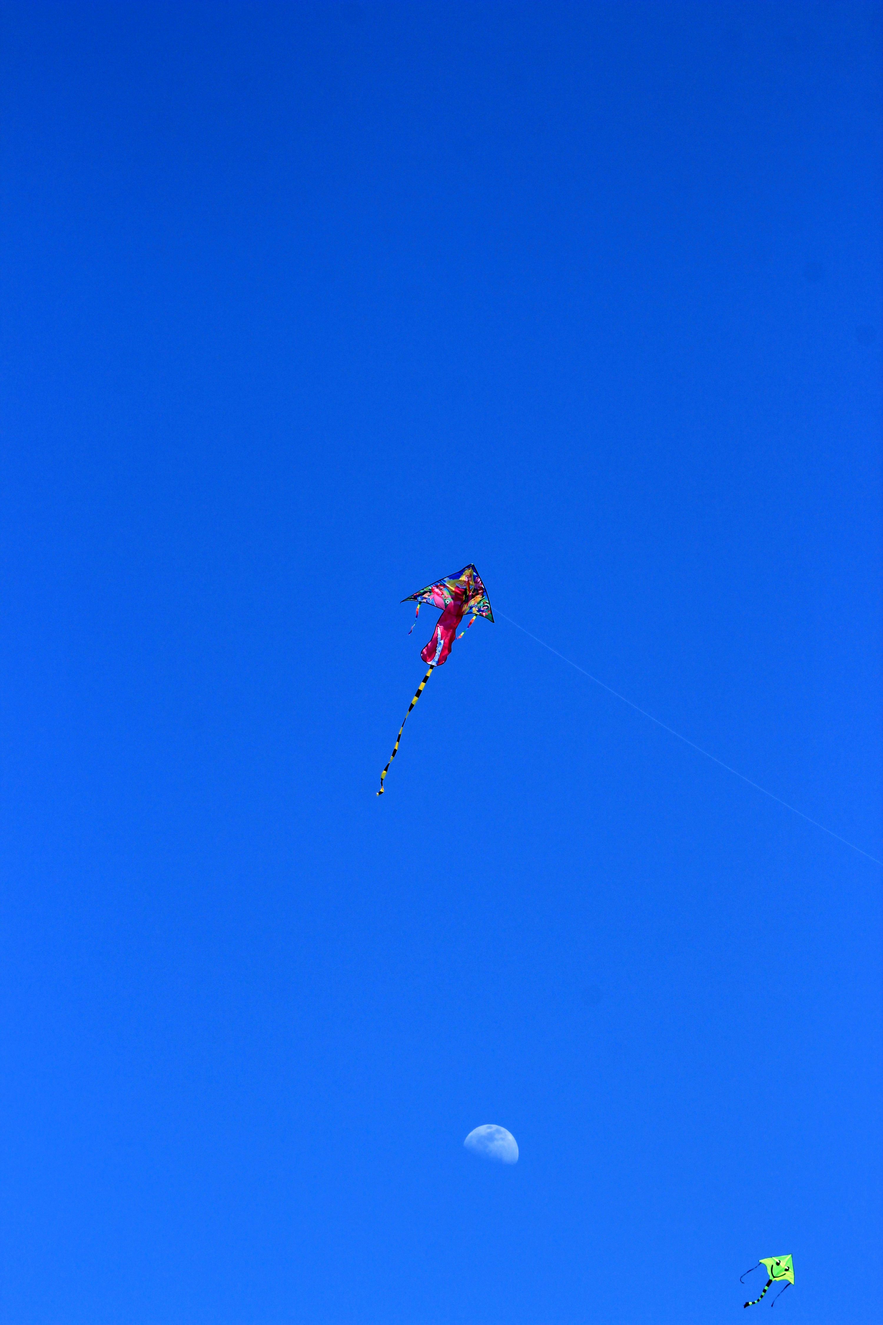 湛蓝天空中上演“风筝追月”