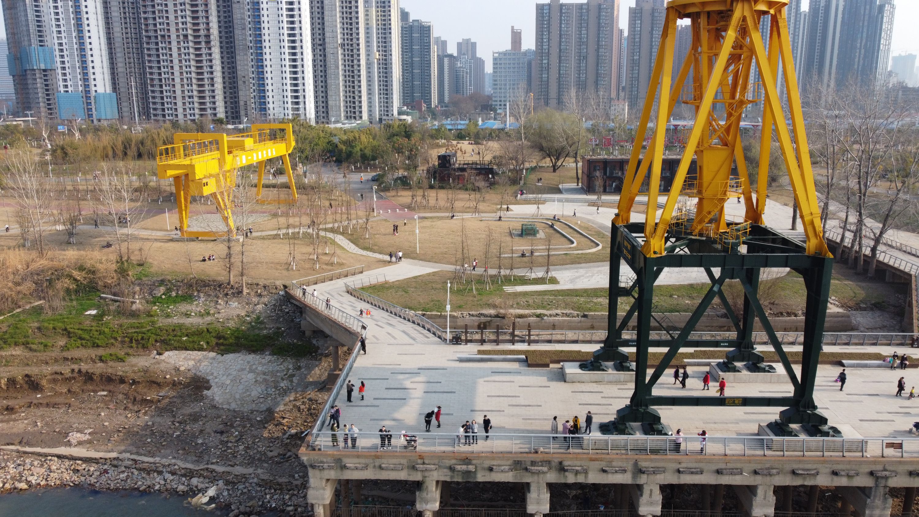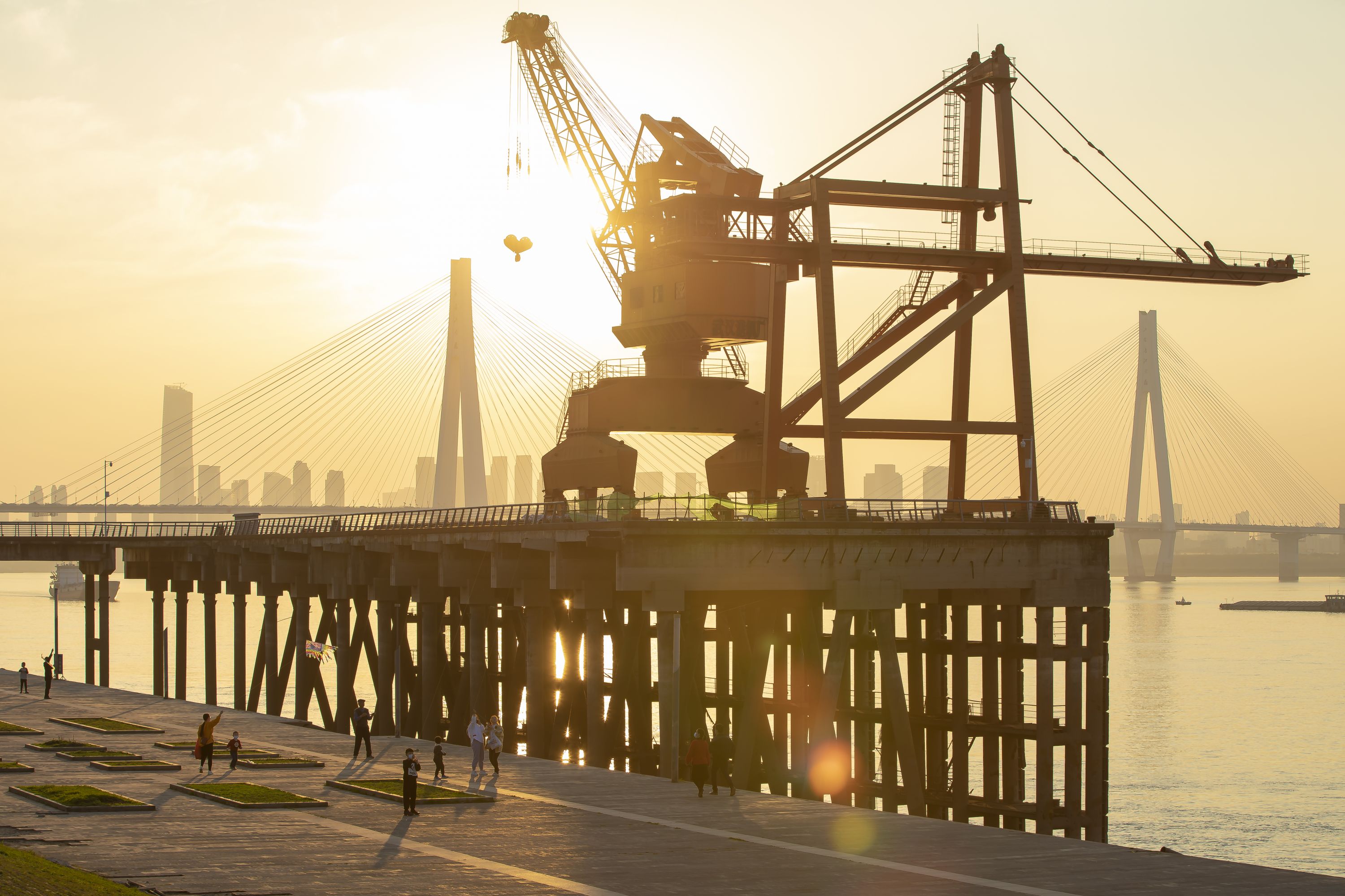 青山江滩内的五粮库码头、中江实业码头、中国一冶重件码头的“工业风”城市景观,几十米高的大吊机成热门打卡点,特色工业风加上青山江滩优美的环境,吸引了大量游客的目光。橙黄色的吊机、起重机不仅保留了江滩的工业文化,也融入了现代气息,成为大家拍照“打卡”的首选。