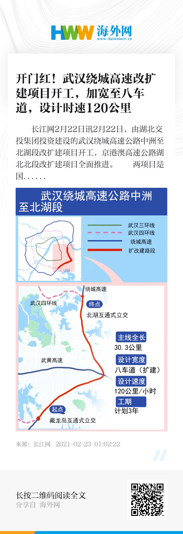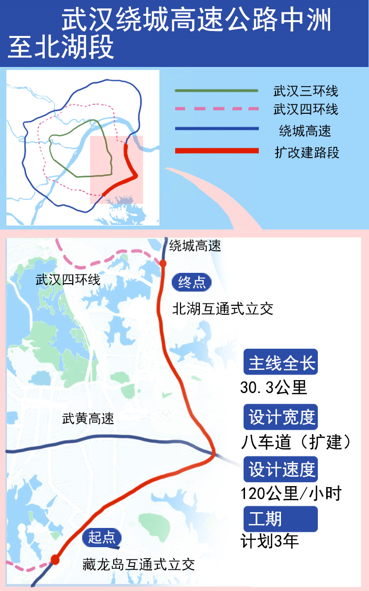 项目起于武汉四环线与武汉绕城高速公路相交的藏龙岛(枢纽)互通式立交,经江夏区、东湖高新区、青山区,止于武汉绕城高速公路与武汉东四环相交的北湖(枢纽)互通式立交,全长30.3公里,投资规模约41亿元。目前工程项目可行性研究报告、初步设计及施工图设计已批复;施工、监理等参建单位已进场,驻地建设已完成。