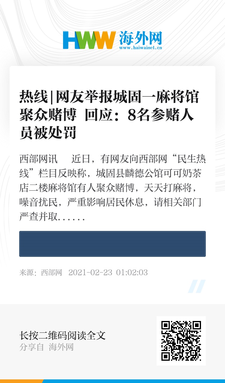 2月20日,城固县公安局回复称,接到群众举报后,城固县公安局三里桥派出所民警立即前往被举报地点核查,在麟德公馆门口可可奶茶店二楼现场查获8人赌博,根据《中华人民共和国治安管理处罚法》第七十条对8个参赌人员分别给予200元行政处罚,对提供赌博场所的老板李某某处以500元的行政处罚,并将用于赌博的电动麻将桌,麻将予以收缴。