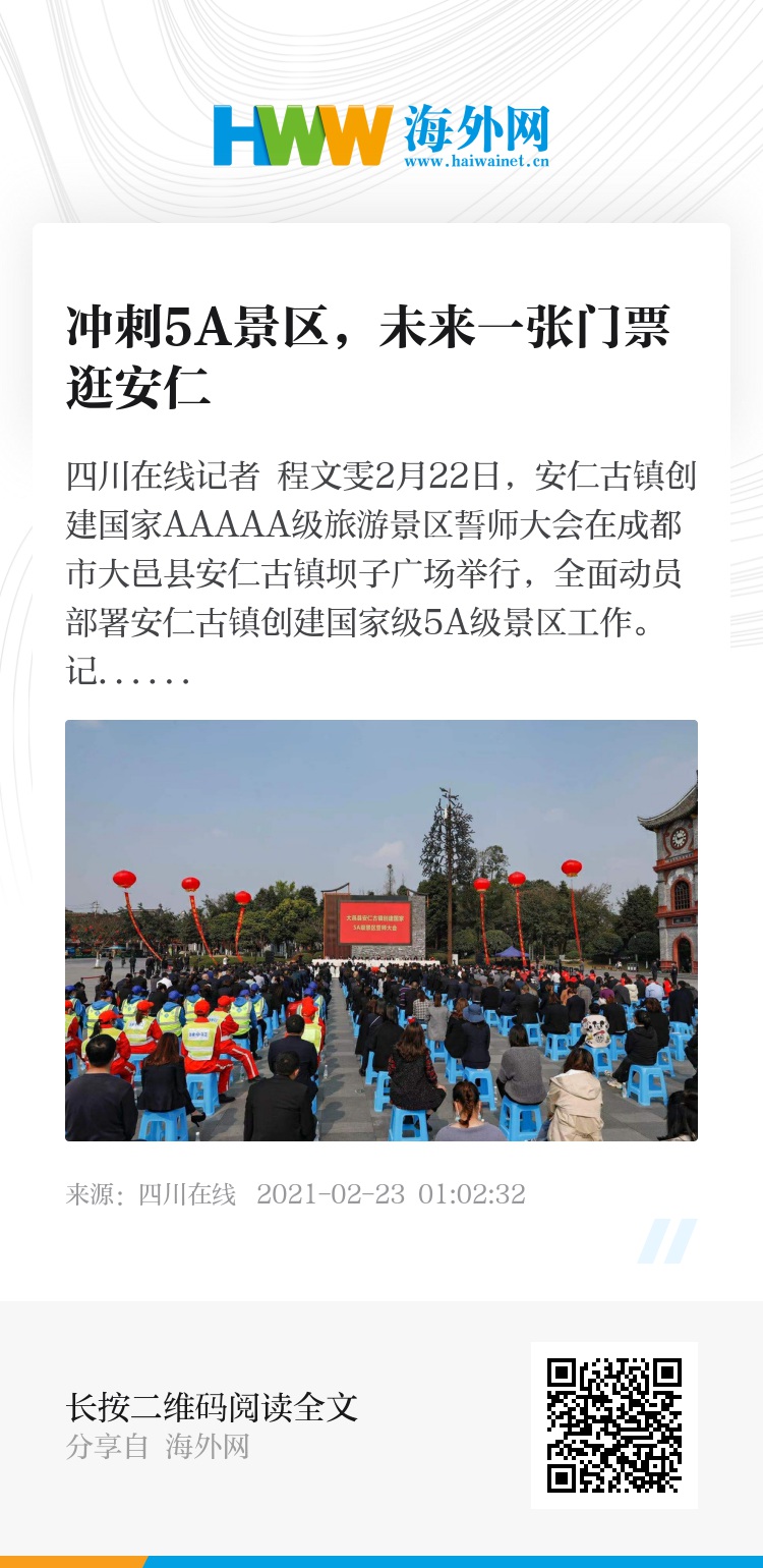 2月22日,安仁古镇创建国家AAAAA级旅游景区誓师大会在成都市大邑县安仁古镇坝子广场举行,全面动员部署安仁古镇创建国家级5A级景区工作。记者获悉,安仁正在着手建立统一售票旅游介绍平台,未来可实现一张门票逛遍刘氏庄园博物馆、建川博物馆等古镇景区核心景点。