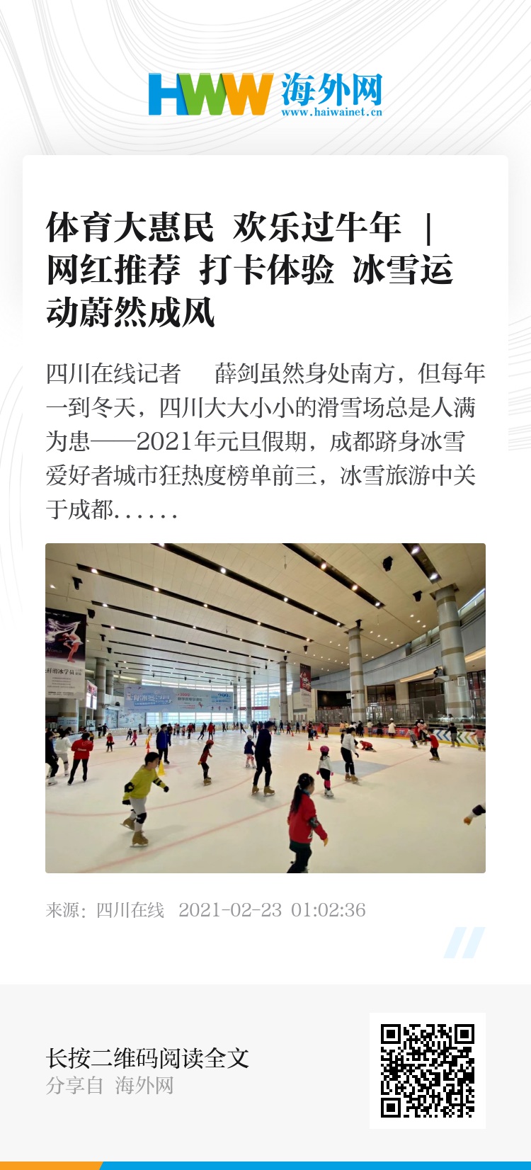 虽然身处南方,但每年一到冬天,四川大大小小的滑雪场总是人满为患——2021年元旦假期,成都跻身冰雪爱好者城市狂热度榜单前三,冰雪旅游中关于成都的搜索量短时间内上涨540%。春节期间,热度不减。网红推荐、打卡抢红包,在四川省第三届全民健身冰雪季的推动下,滑雪、滑冰成为这个冬天四川流行的运动方式。