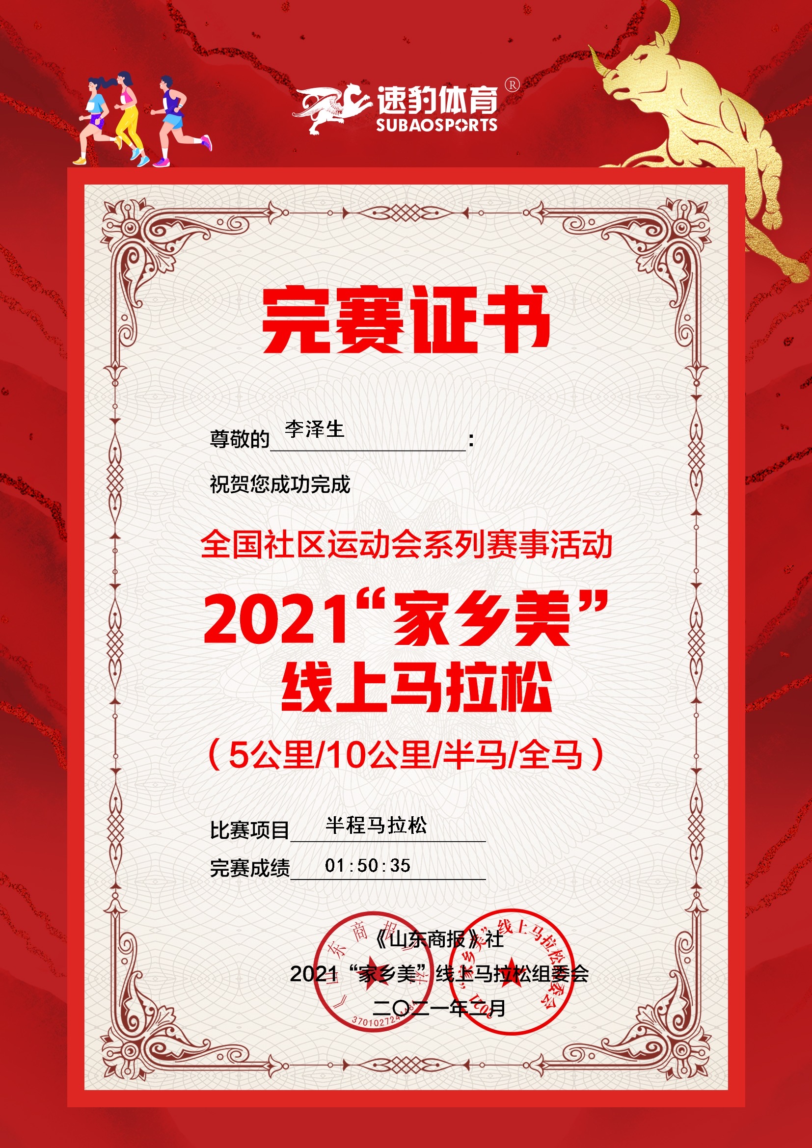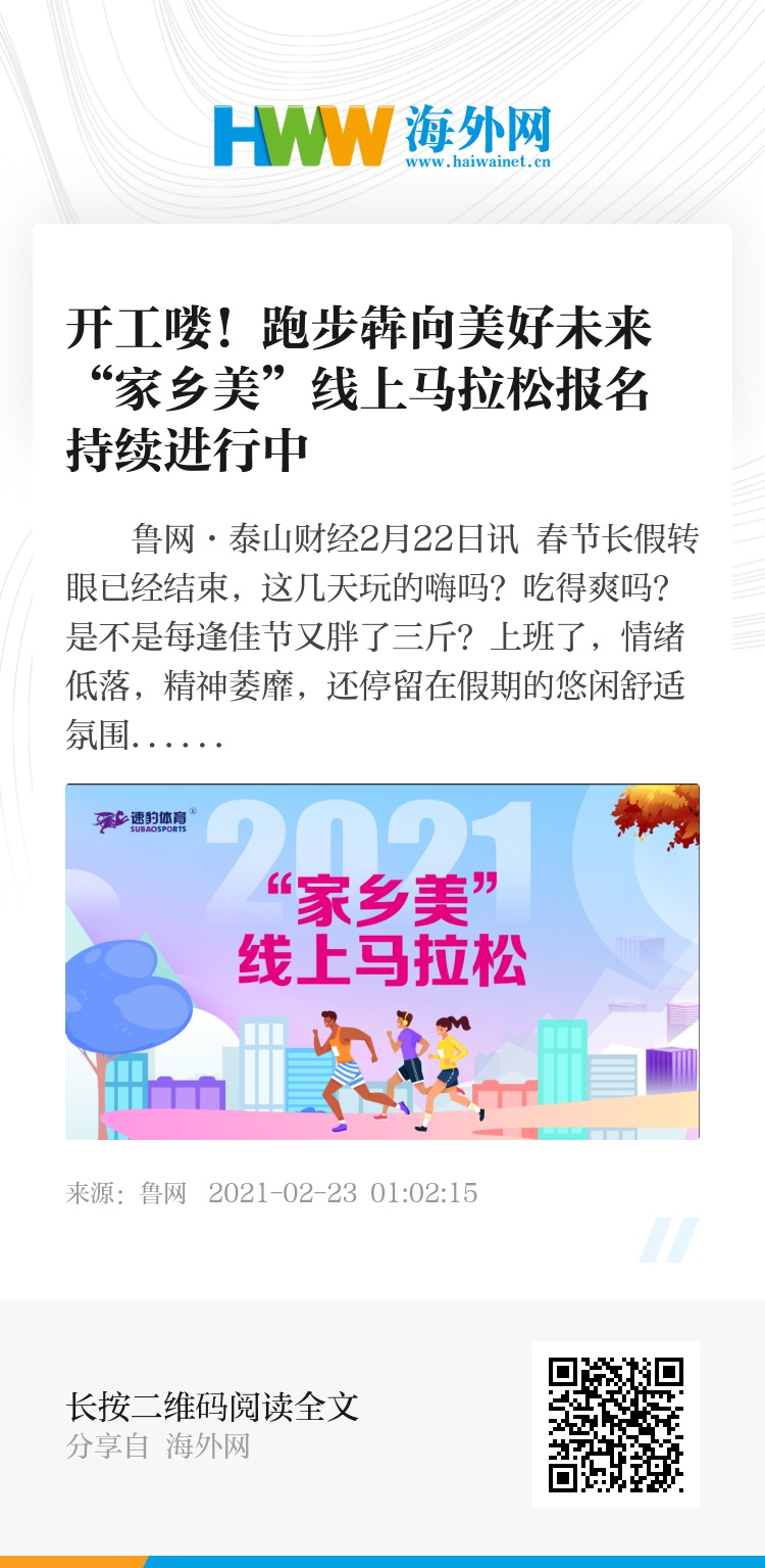由《山东商报》社、鲁网、速豹体育为主办单位、中华全国体育总会为指导单位的全国社区运动会系列赛事活动—2021“家乡美”线上马拉松自2月5日启动以来,受到广大跑友的广泛关注,目前活动持续进行中,越来越多的跑友们参与到这次有意义的活动中来,跑步健身上传成绩,晒晒自己家乡的美,也算为家乡的发展尽一份绵薄之力。