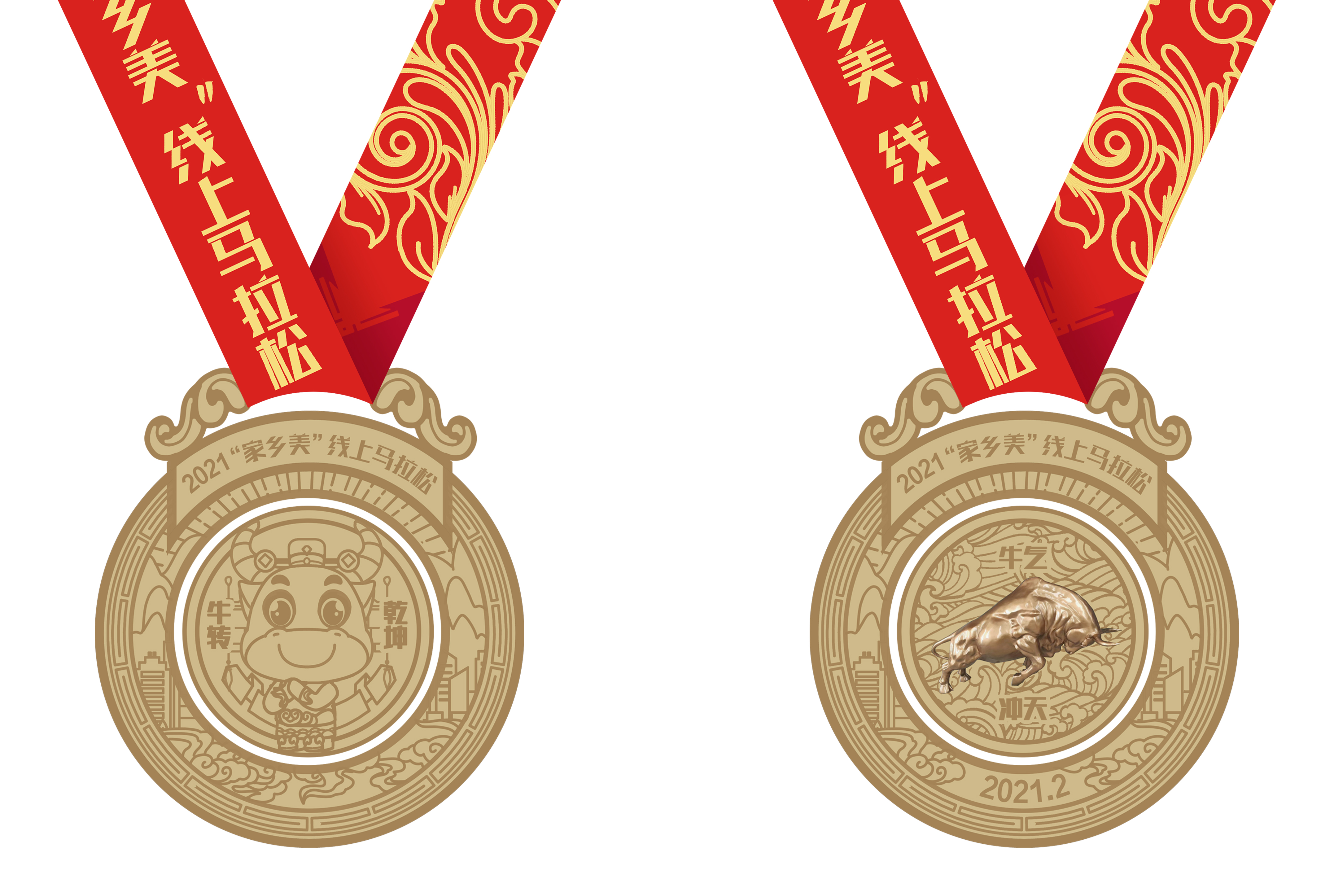 本次比赛奖牌主题为“扭转乾坤”,以2021牛年属相为元素,正面卡通牛代表着每个人心中都有童趣的一面,反面霸气牛代表着每个人都有一颗不服输的心。中间图案“牛”可以旋转,代表每个人心中可刚可柔。柔,可在自己美丽的故乡恣意行走。刚,可在高楼林立的城市中扎根立足。奖牌整体设计呈现其独特魅力,意在祝福跑友在新的一年:扭转乾坤,牛气冲天!