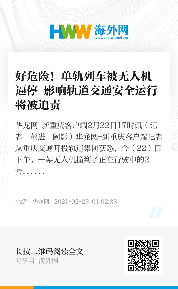 华龙网-新重庆客户端2月22日17时讯(记者 董进 阙影)华龙网-新重庆客户端记者从重庆交通开投轨道集团获悉,今(22)日下午,一架无人机撞到了正在行驶中的2号线单轨列车,目前该趟列车暂时未发现损伤,线路运营也没有受到影响。