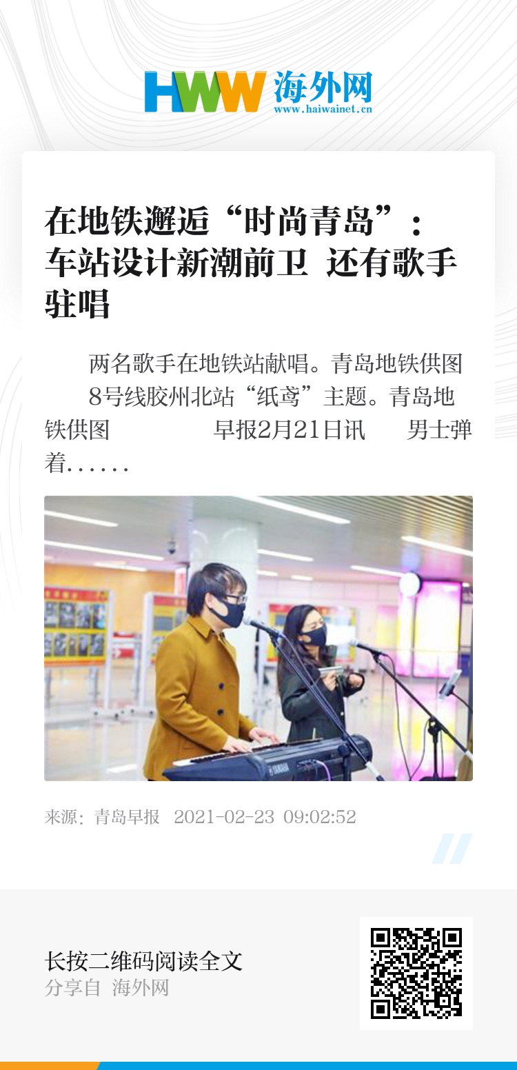 春节期间,出入地铁五四广场站、李村站的市民经常会看到这样的场景。这是青岛地铁与歌手联合组织的“我在地铁等你”系列公益活动之一。悠扬美妙的歌声回荡在地铁站厅里,为冬日归家途中的乘客送去了一份温暖,也让地铁站厅变身网红时尚打卡地,为岛城地下城市空间注入一股温暖时尚新活力。