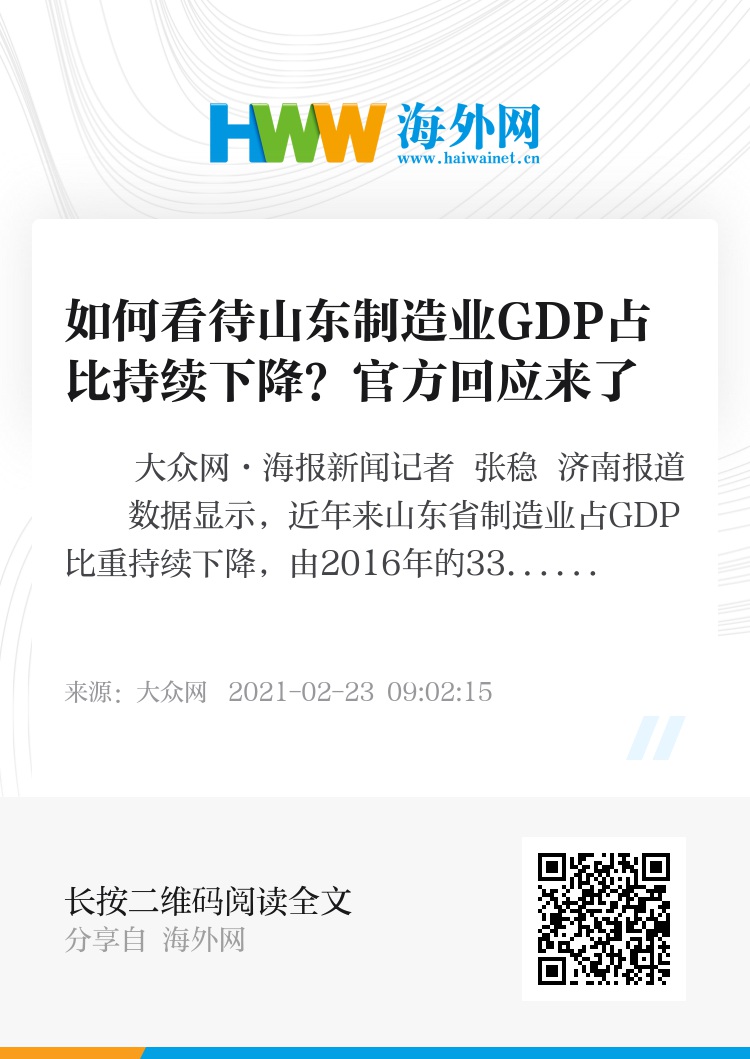 数据显示,近年来山东省制造业占GDP比重持续下降,由2016年的33.5%下降到2019年的27.8%。如何看待这种变化?这是否会影响“十四五”时期先进制造业强省建设目标的实现?2月22日下午,山东省政府新闻办“展望‘十四五’”主题系列新闻发布会第三场新闻发布会专门对此进行了解读。