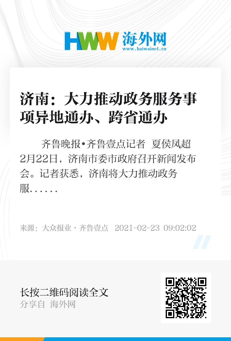 2月22日,济南市委市政府召开新闻发布会。记者获悉,济南将大力推动政务服务事项异地通办,优化“全城通办”,拓展“全省通办”,推进更多政务事项“跨省通办”。
